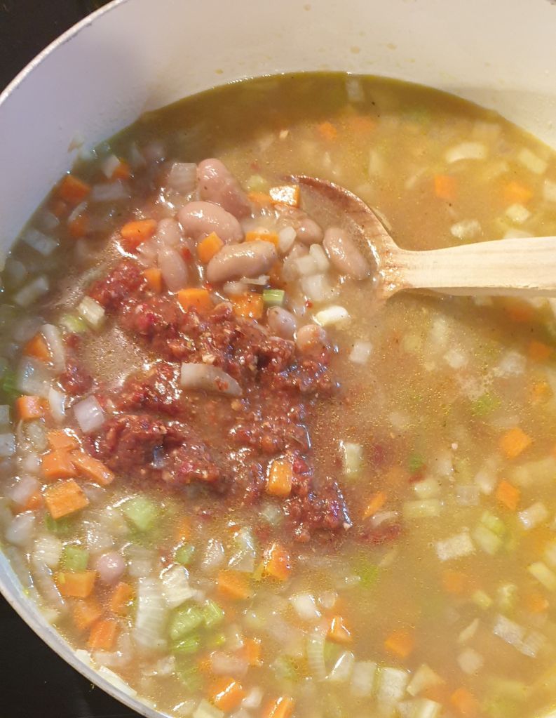 Добавете сварения боб, заедно с течността му и пастата от сушени домати.