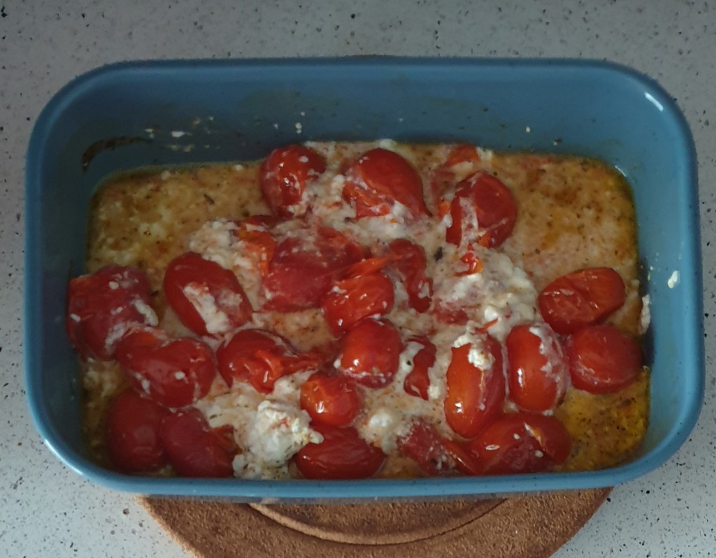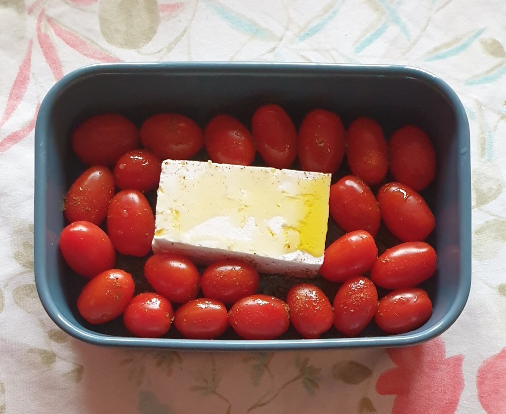 Исках ястието да е нещо бързо и просто – от тези които стават перфектно вкусни, въпреки късия лист с подукти. Затова се спрях на една идея на eat.healthy.bg с чери домати и сирене печени на фурна. Получи се идеално балансирано, едновременно леко и засищащо ястие. Беше готово за половин час (без да броим времето за приготвяне на пастата).