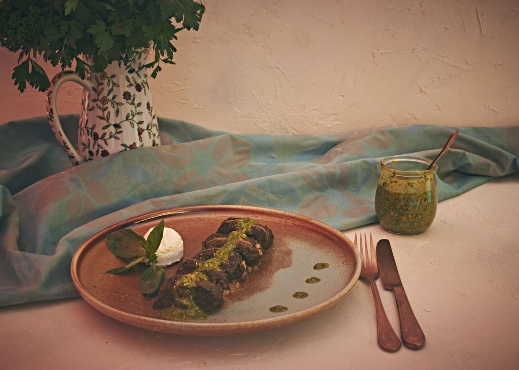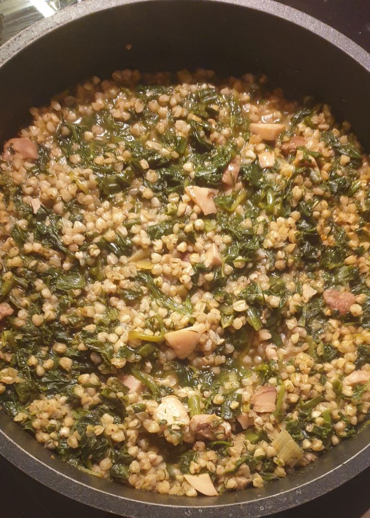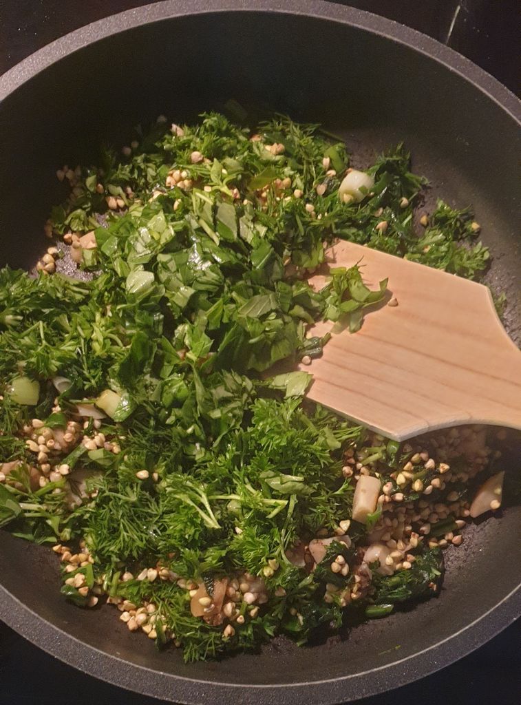 Още щом видях идеята, беше ясно, че ще направя нещо подобно. Замених копривата (която не обичам) със спанак, булгура с елда и челядинките с манатарки. Гарнирах с цедено козе кисело мляко и веган песто от босилек и левруда.