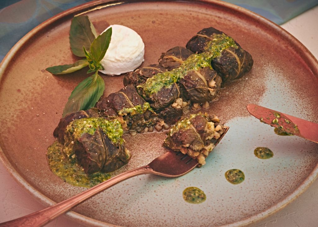 Сервирайте сармите с песто и цедено кисело мляко.