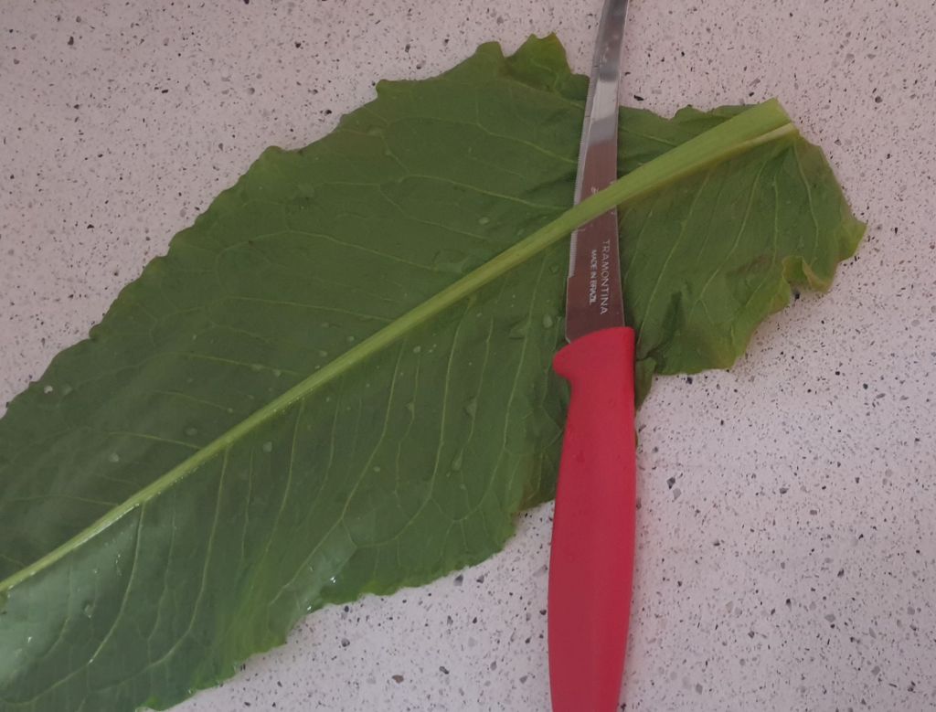 Докато пълнежът се готви, измийте внимателно листата от лапад. Отрежете дръжките и, с помощта на остър нож, изтънете основните жили на гърба на листата. Това ще направи завиването по-лесно.