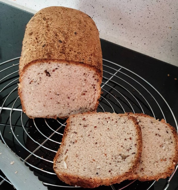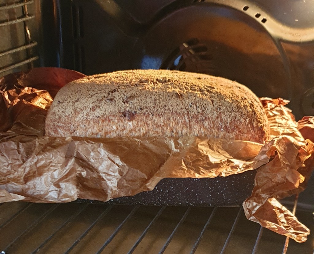 Тази рецепта, която направих, когато квасът ми стана готов, е за многозърнест хляб. Пече се в обикновена правоъгълна форма и има един период на ферментация (не стандартните два).