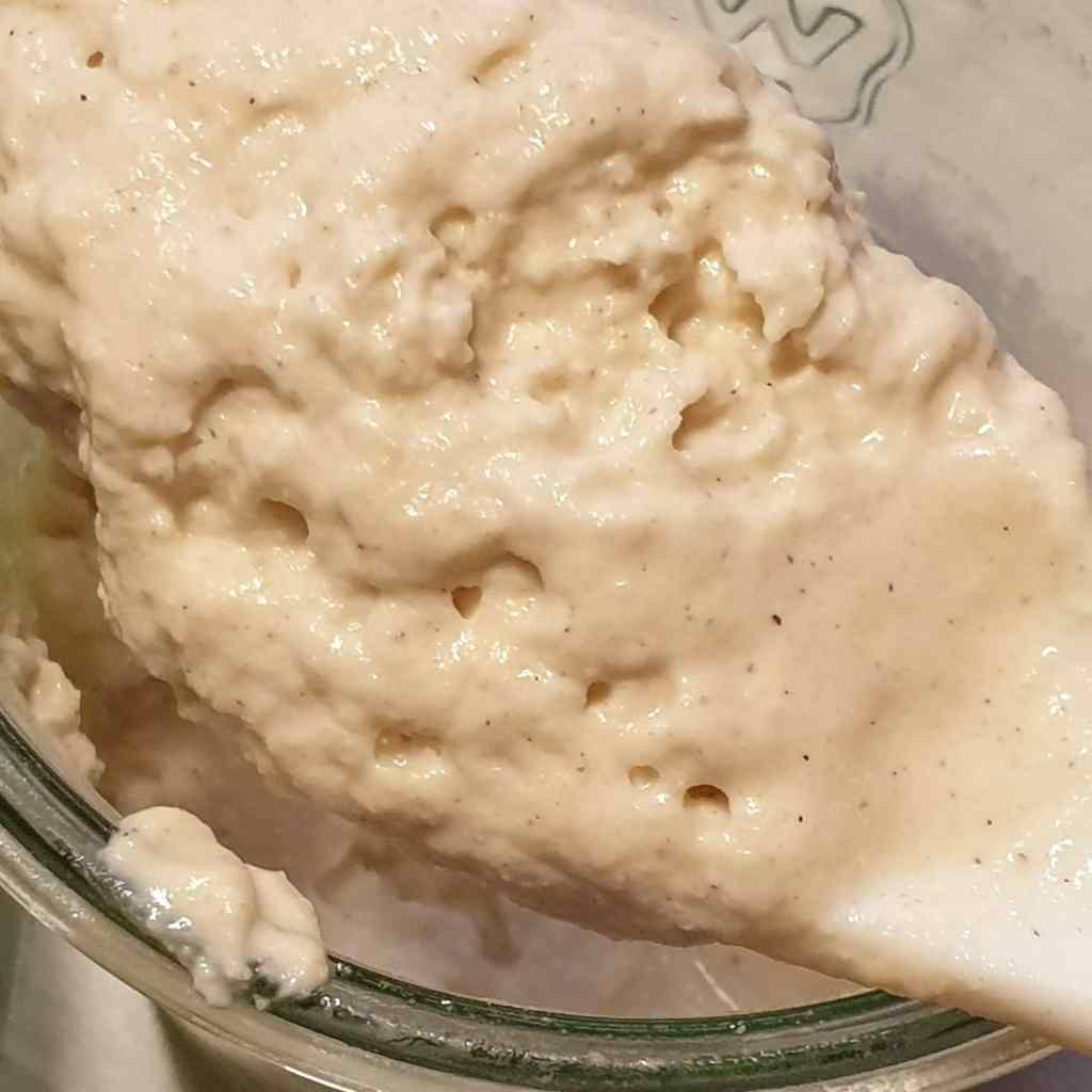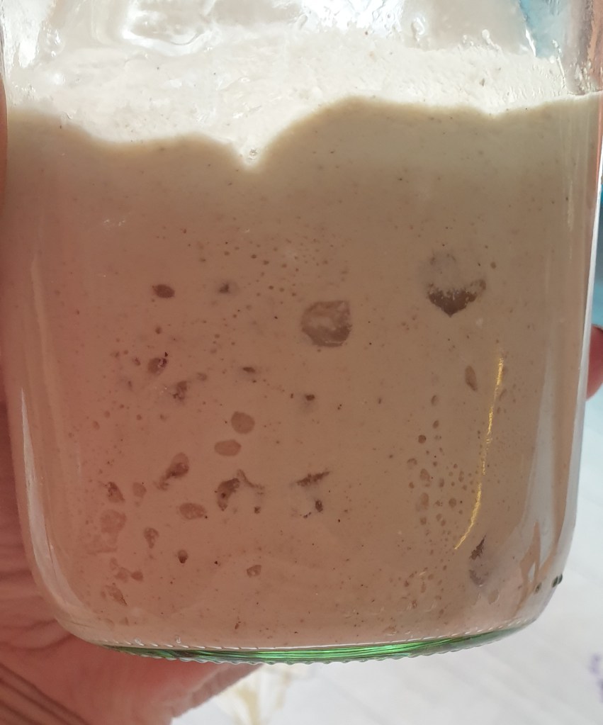 Ако има мехурчета и/или кисела миризма, отстранете цялата течност, която е най-отгоре и около 1/3 от останалия обем. След това добавете ½ чаша от пълнозърнестото брашно (или смес от брашна) и ½ чаша филтирана или изворна вода. От този момент нататък може да замените пълнозърнестото брашно с безглутенов бленд без гума ксантан.