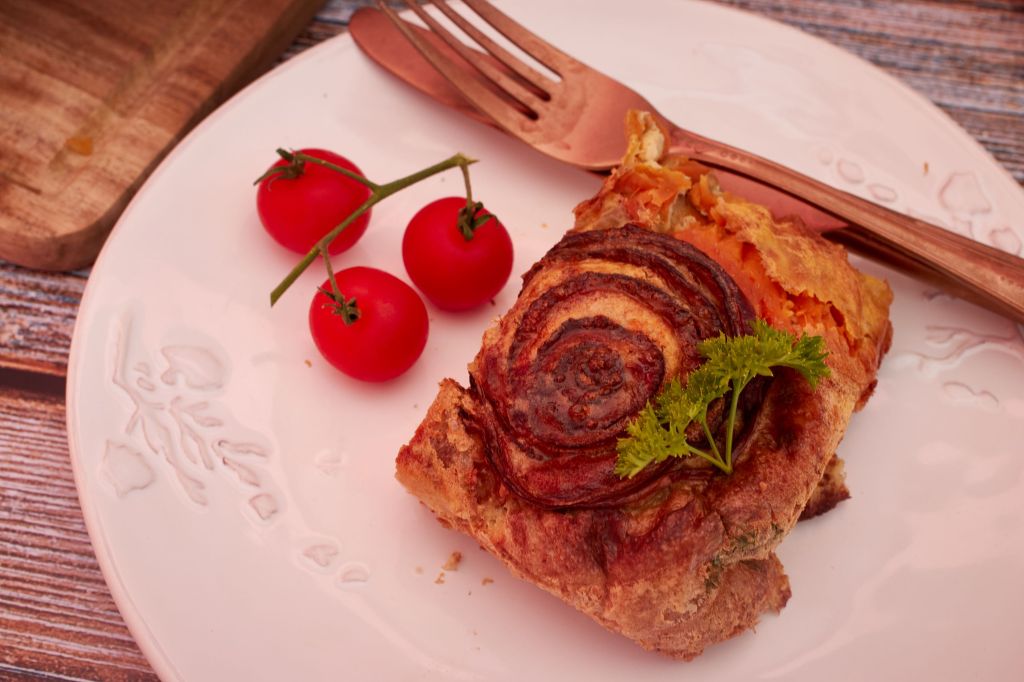 След това замених картофите със сладки, лука с червен и добавих чесън и индийско орехче. Съвсем естествено получих едно различно ястие, което обаче е много вкусно и освен това е красиво, особено преди разрязване.
