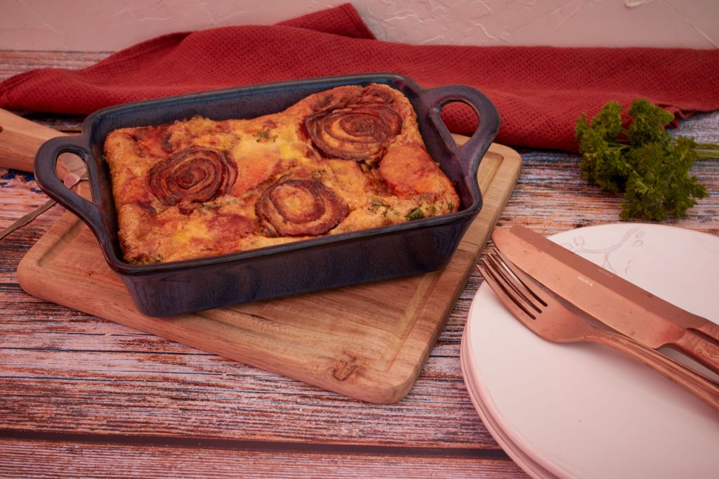 За по-атрактивен вид, може да запазите 2 – 3 шайби лук и да ги разположите най-отгоре. Върнете във фурната, намалете на 180 градуса и печете още 20 – 25 минути.