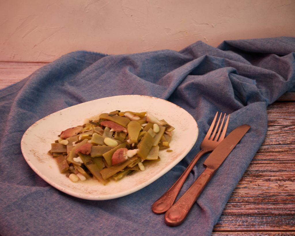 1 кг зелен боб, почистен и нарязан. Лично аз предпочитам да изрежа и жилите отстрани. Така решавам радикално въпроса с досадните „конци“.