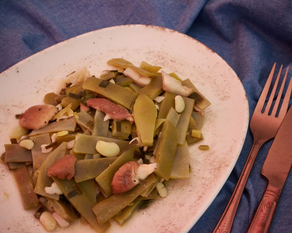 В дълбок тиган загрейте половината масло. Добавете салвията и задушете за 2 – 3 минути, след което извадете от тигана. Сложете останалото масло и, когато се разтопи, добавете пресния лук задушете за 3 – 4 минути. Добавете чесъна и разбъркайте. След около половин до една минута добавете гъбите и виното и гответе докато течността намалее на половина. Добавете зеления боб и разбъркайте. Оставете на котлона още минута – две. Преди сервиране върнете салвията и разбъркайте.