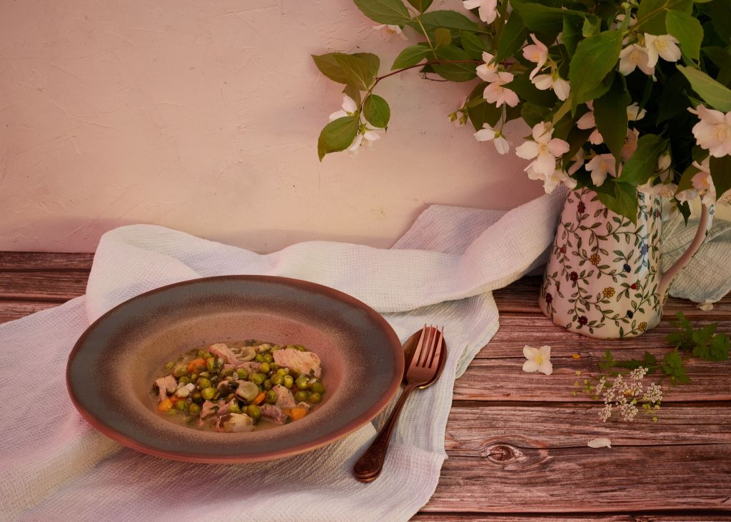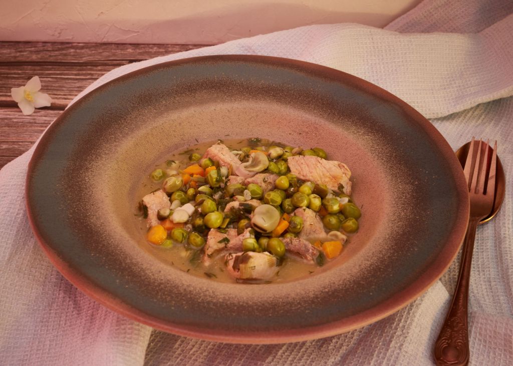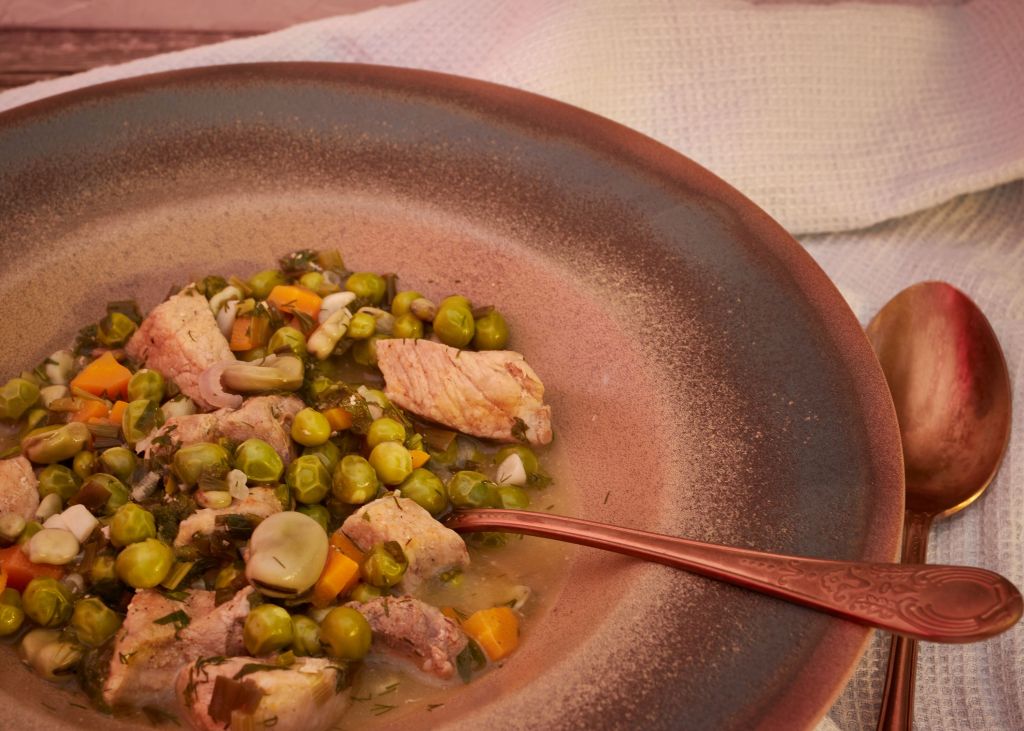 Продължавам одата за пресните пролетни варива с тази рецепта. Разбира се, тя може да се направи и без месо или с гъби вместо него. Но аз съм в отбора на месоядните и веднъж-два пъти седмично то присъства на масата. А какъв по-добър начин да сервираме месото от ястие с много сезонни зеленчуци и пресни подправки?