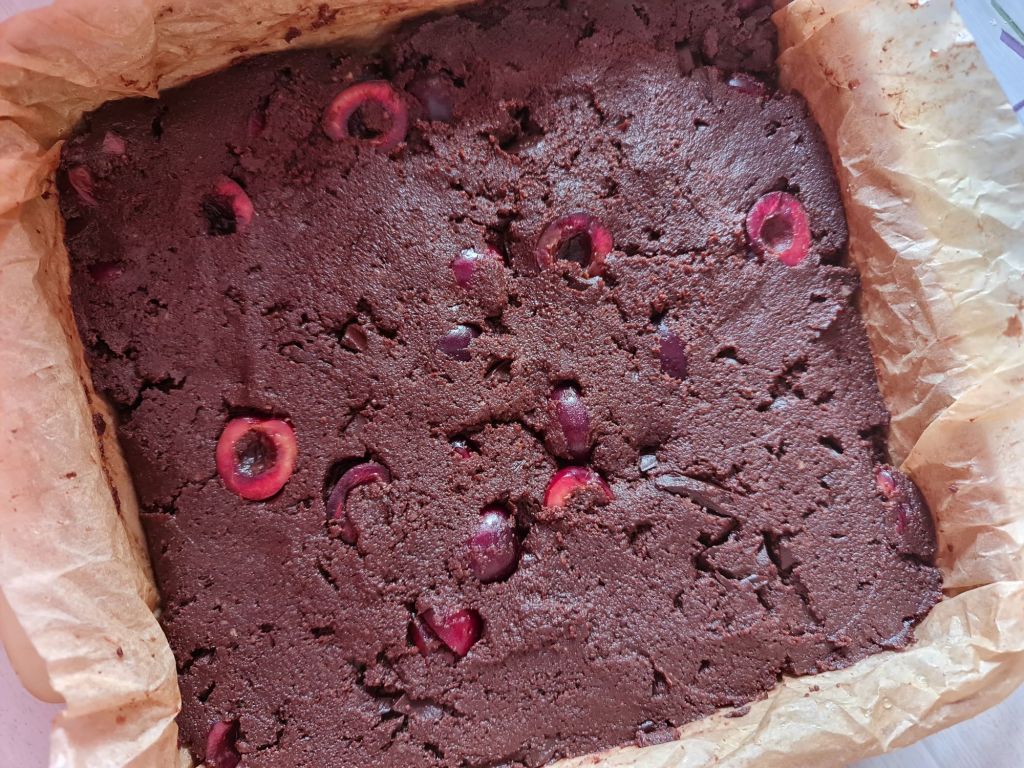 Добавете шоколада и черешите и разбъркайте внимателно, без да разкъсвате плодовете. Прехвърлете в тавата и заравнете с шпатула.