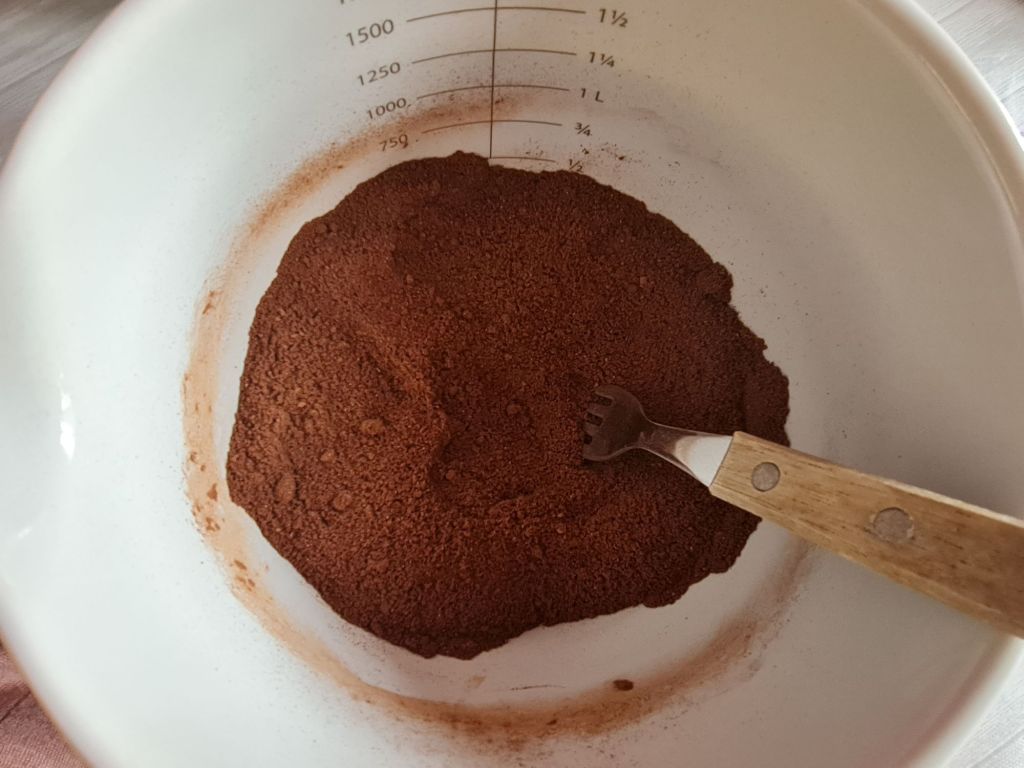 В друга купа смесете брашното, какаото, хуска, бакпулвера, настъргания боб тонка и солта. Разбъркайте много добре.