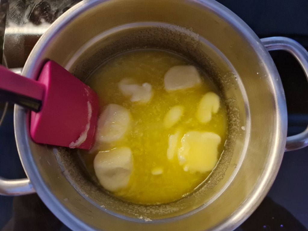 В малка тенджера загрейте маслото и половината от еритритола на ниска степен, до стапяне на маслото.