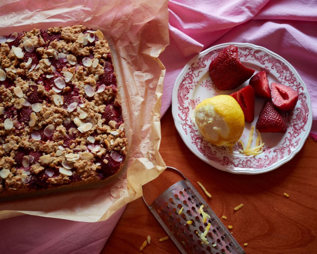 Върху тях разпределете останалата смес, но не притискайте. Настържете лимоновата кора и разпръснете филираните бадеми.
