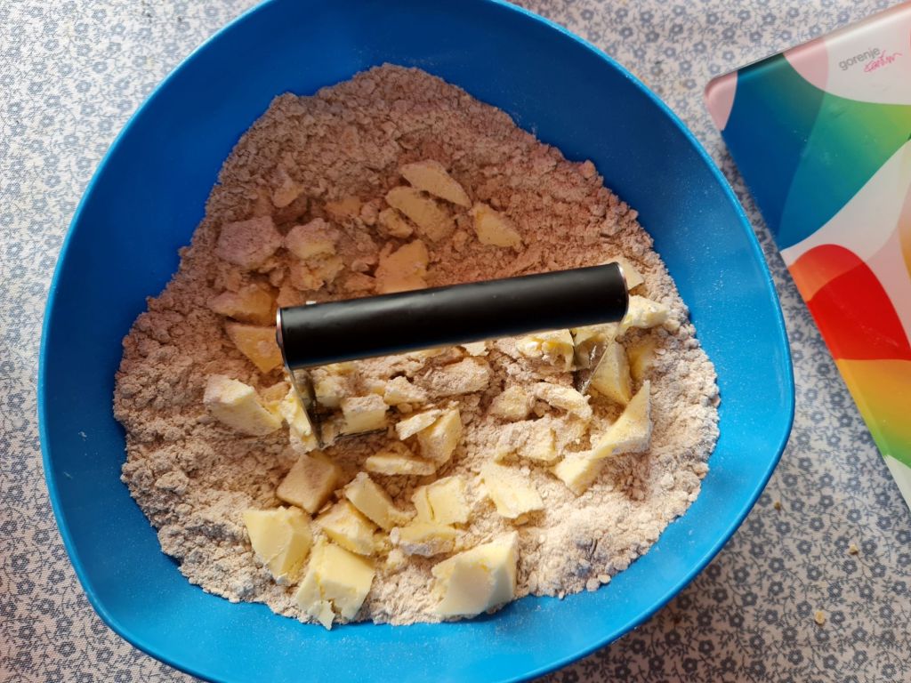 В достатъчно голяма купа смесете овесените ядки, брашното, бакпулвера и кето карамела. Разбъркайте много добре. Добавете маслото и с помощта на ръчен блендер или по-голяма вилица го вкарайте в сместа, докато получите трохи.