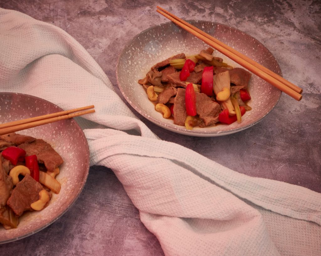 Понеже месото и гъбите са достатъчно засищащи, пропуснах ориза, но добавих малко кашу. Нямам уок и ползвах дълбок чугунен тиган, който свърши чудесна работа. Тъй като времето за готвене е много кратко, зеленчуците се запазват сочни и хрупкави.