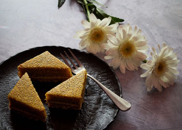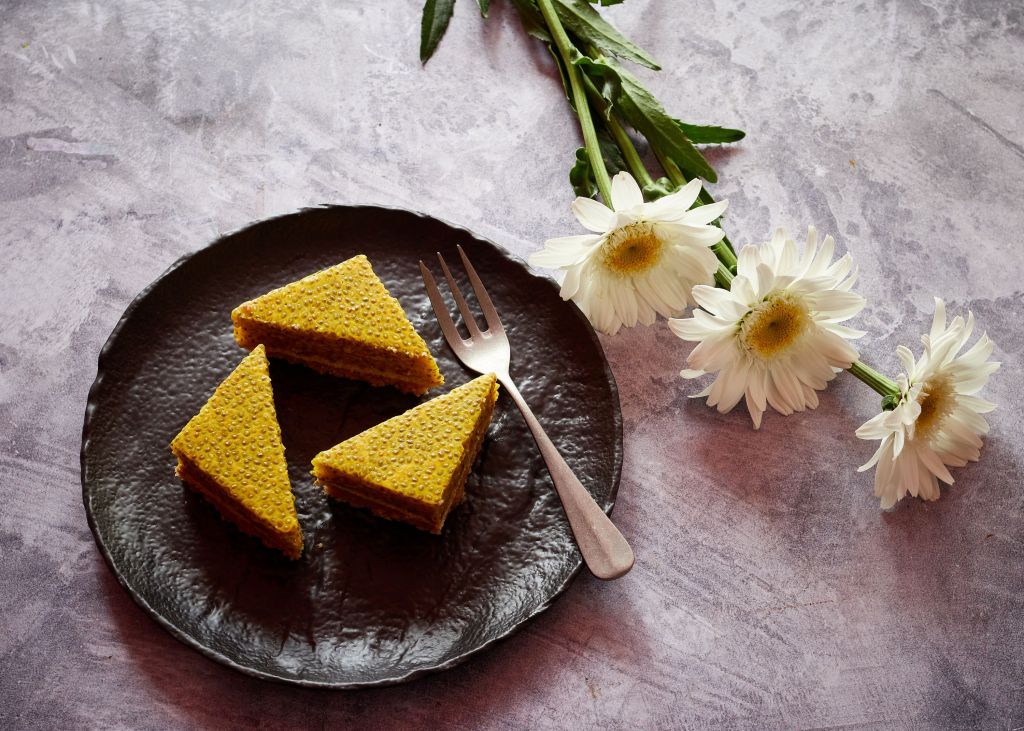 Загрейте фурната до 180 градуса и пригответе тава с размери 20 х 20 см, покрита с хартия за печене. Най-удобно е ако е форма със свалящи се стени, но и друга ще свържи работа. Може да замените с кръгла форма с диаметър 22 – 23 см. Аз ползвах правоъгълна, за да нарежа десерта на малки триъгълници.