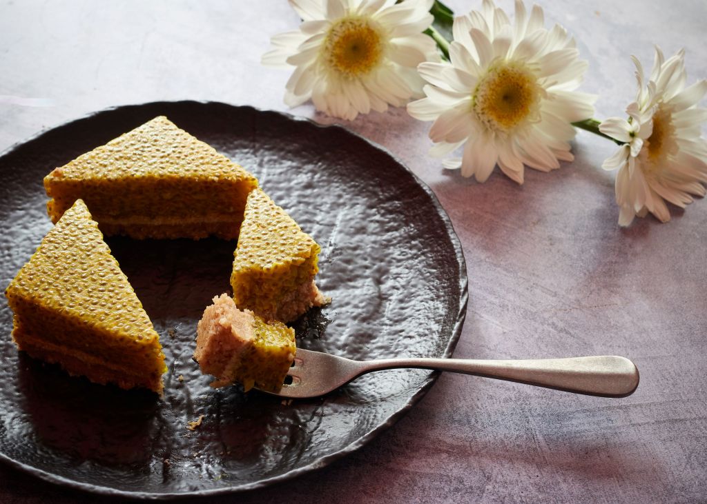 Извадете от хладилника и оставете 15 – 20 минути, за да се отпусне леко основата. Извадете от формата и с остър нож нарежете на триъгълници по схемата. Три триъгълника правят една порция.