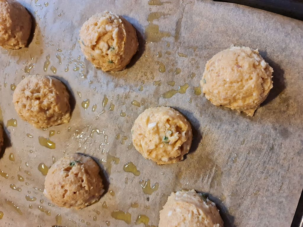 Опитайте да оформите кюфтета. Ако тестото не е достатъчно гъсто, добавете галета. Аз ги направих с лъжица за сладолед, общо 12, по 4 на порция.