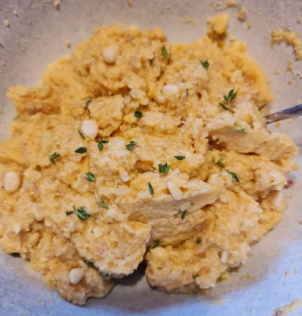 За рецептата за паста с гъби проучих много внимателно с какво най-добре се комбинира пачият крак и сега задачата беше най-вече да постигна вярната консистенция, така че кюфтетата да не се разпаднат или разлеят прекалено при печене. Обикновено яйцата се ползват като свързващ агент, но аз реших да опитам без тях и ги замених с хуск и вода. Получи се много добре, но ако не ви се занимава, или нямате хуск на прах, просто заменете с яйце.