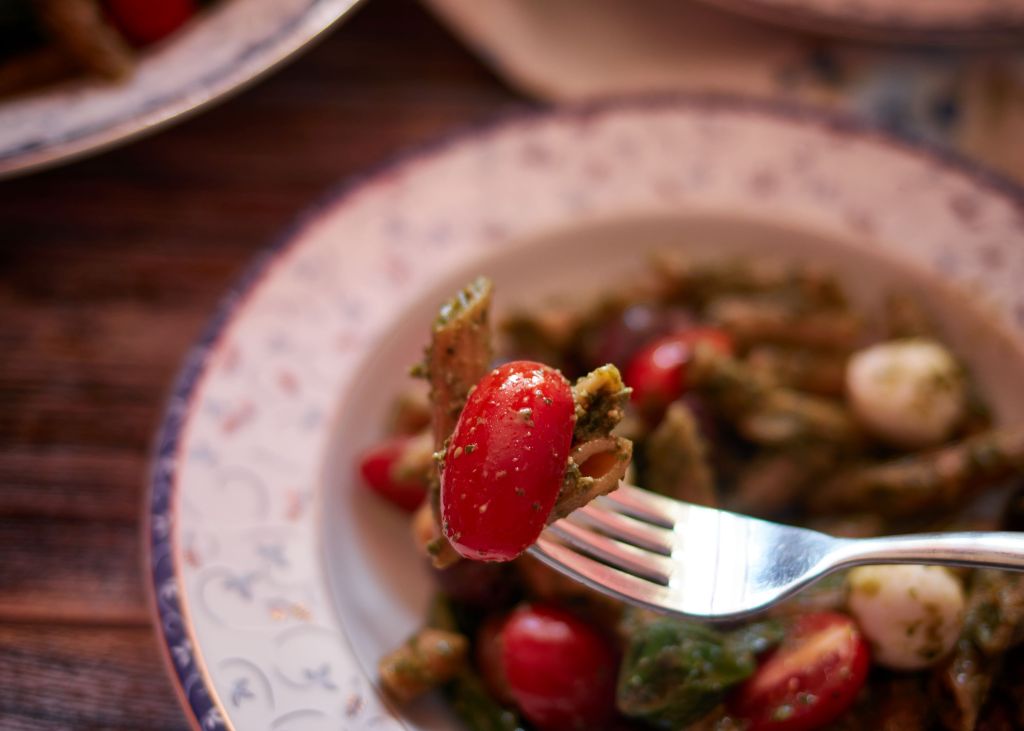Пастата е безглутенова от червена леща и за компания й добавих чери домати, няколко бланширани листа манголд, маслини и мини моцарела. В комбинация с пестото се получи прекрасна и свежа лятна паста салата, която е без глутен и с по-малко захари (само 3.5 г на порция) от очакваното.