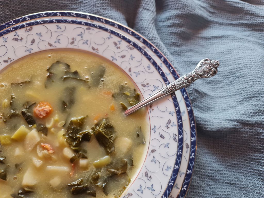 Най-специфичното при португалските супи е, че има пасирана основа. Обикновено е от вода (или бульон), лук и картофи, но може да има и боб. Понякога морковите също са част от основата, но аз предпочитам да ги оставя извън нея, заради веселия им оранжев цвят. Тези по-бавно увиращи продукти се сготвят предварително и се пасират до консистенция на рядка крем супа. След това се добавят останалите зеленчуци, според времето им на варене, и подправките. В много случаи присъства и чоризо, което може да се пропусне. Аз обикновено слагам няколко резена (3 – 4), нарязани на много дребни парченца, така че да овкусят супата, без да я правят мазна и тежка.