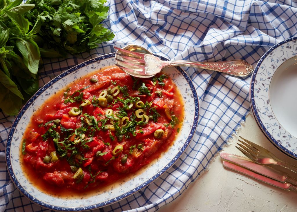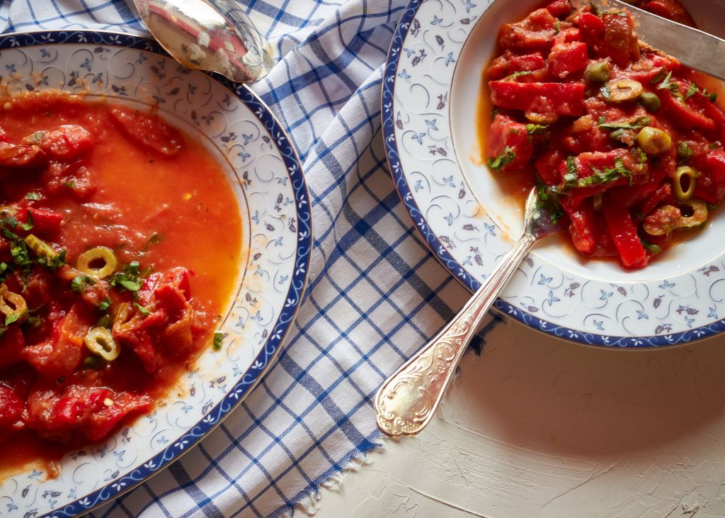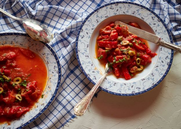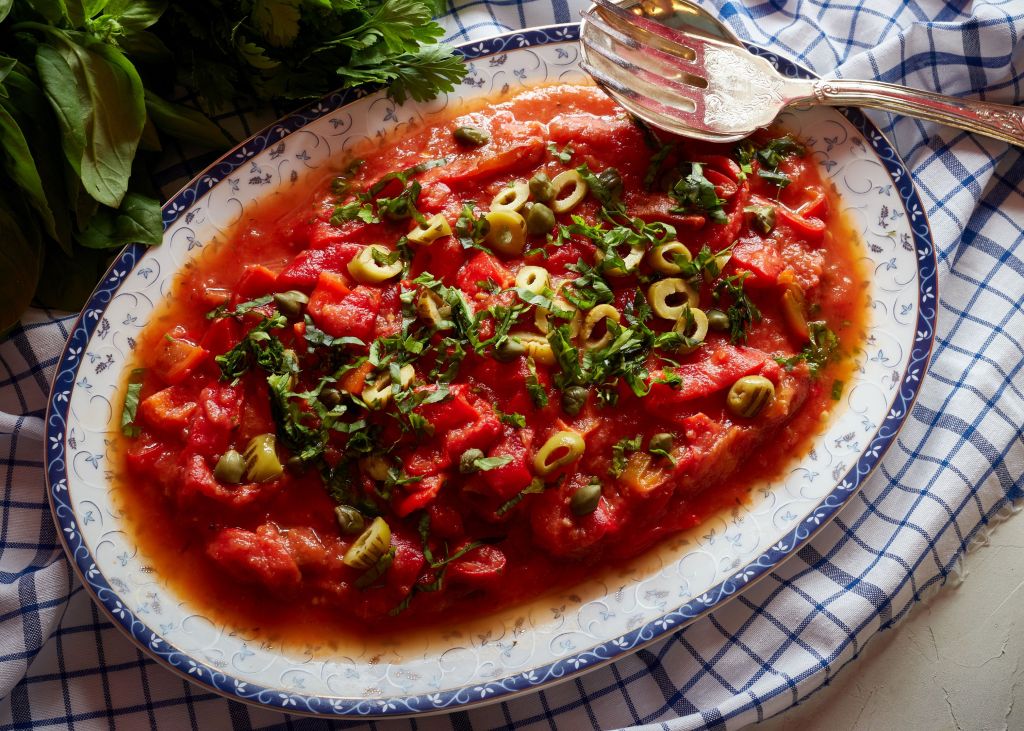 Другата основна разлика е във формата. В класическия вариант чушките са цели, с дръжките (и семките). На вид изглежда добре, но никога не съм харесвала частта с чистенето на семки, докато ги ям. Затова поразгледах и попаднах на италиански вариант – La Peperonata. В него има чушки на ленти и доматен сос. От там си взех и идеята да добавя каперси и маслини.