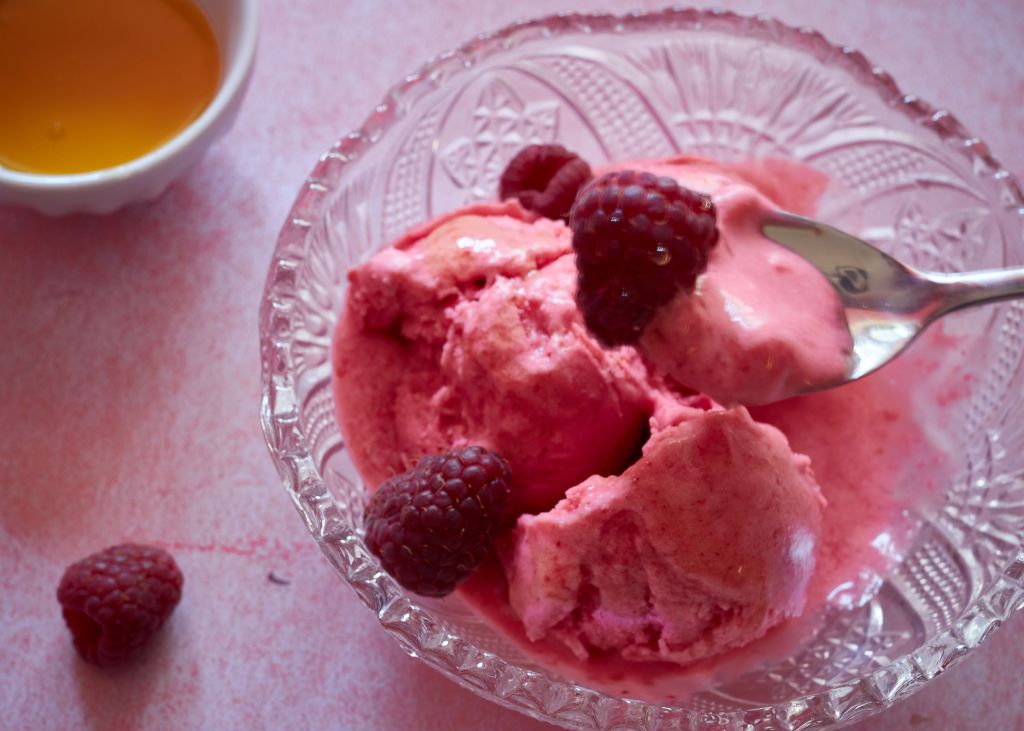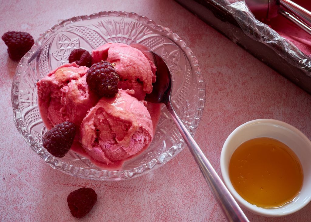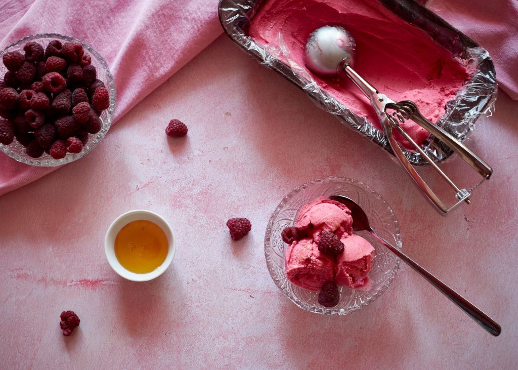 Малините са леко киселеещ плод, дори когато са напълно узрели. Без допълнително подслаждане, сладоледът не би бил достатъчно сладък. Този път сложих мед от Истински мед , който добавя и вкус, а не само сладост.
