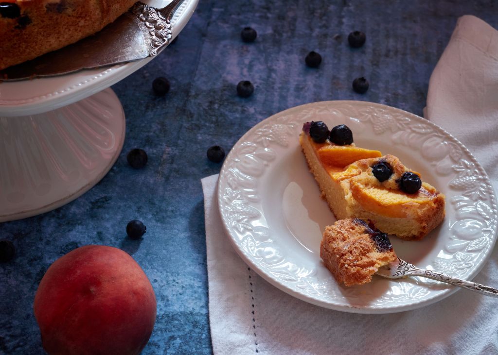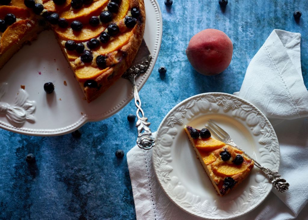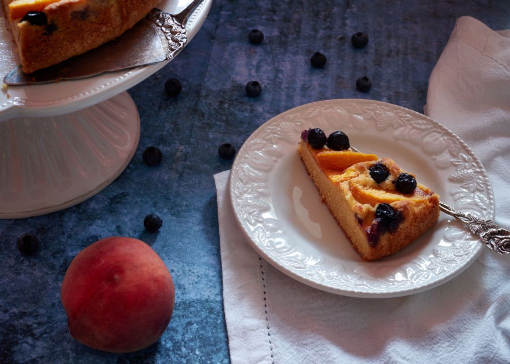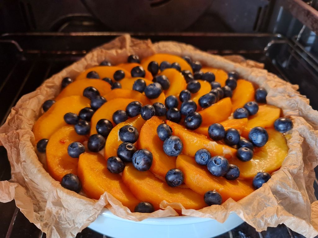След сладоледа и салатата с праскови, дойде ред и на сладкиш от типа плодова пита. Плодовете сега са най-хубави – сочни и събрали топлите слънчеви лъчи. За да обогатя вкуса, добавих шепа сини боровинки и етерично масло от лимон.