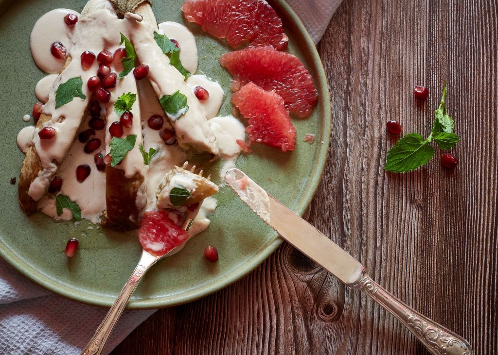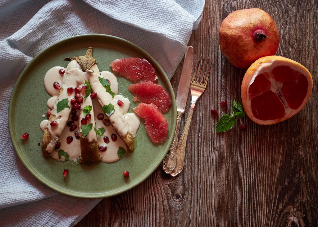 За да сервирате, полейте патладжана обилно със сос и поръсете с нар и няколко листенца мента. Гарнирайте с филетиран грейпфрут.