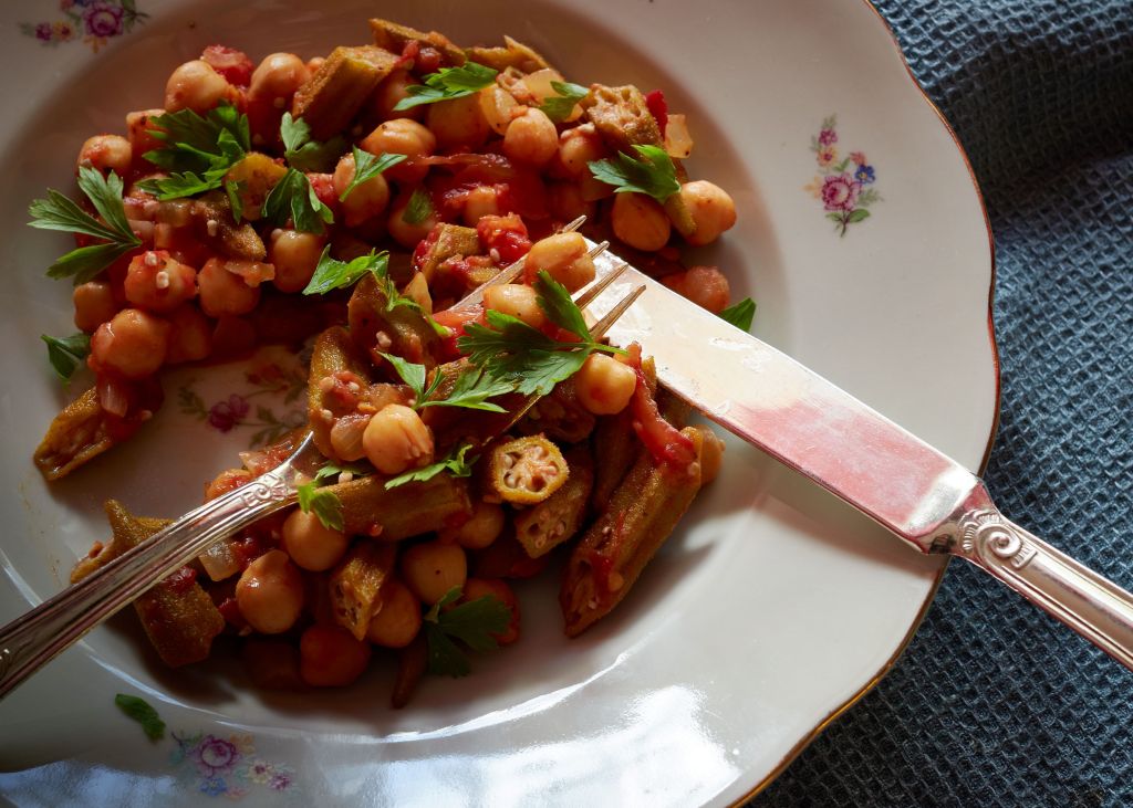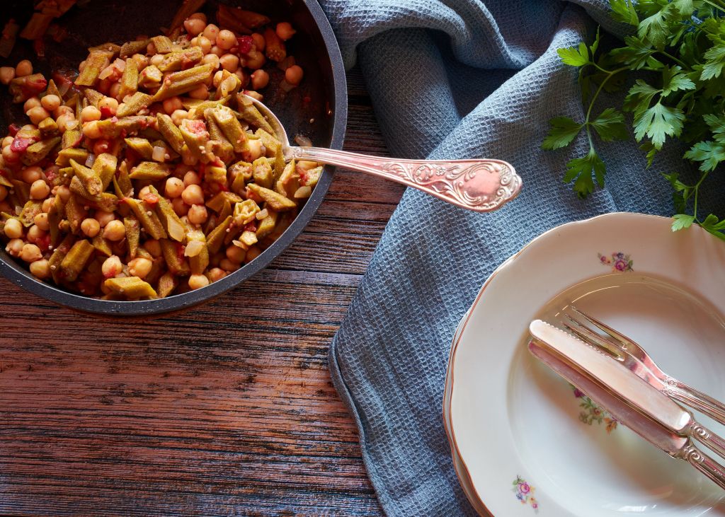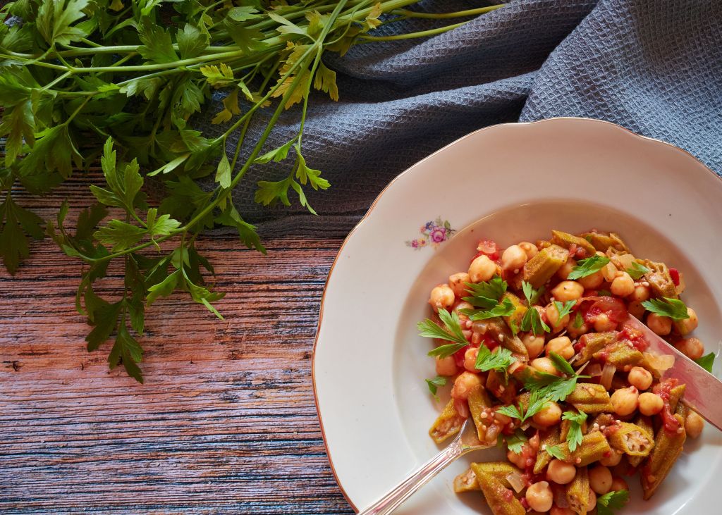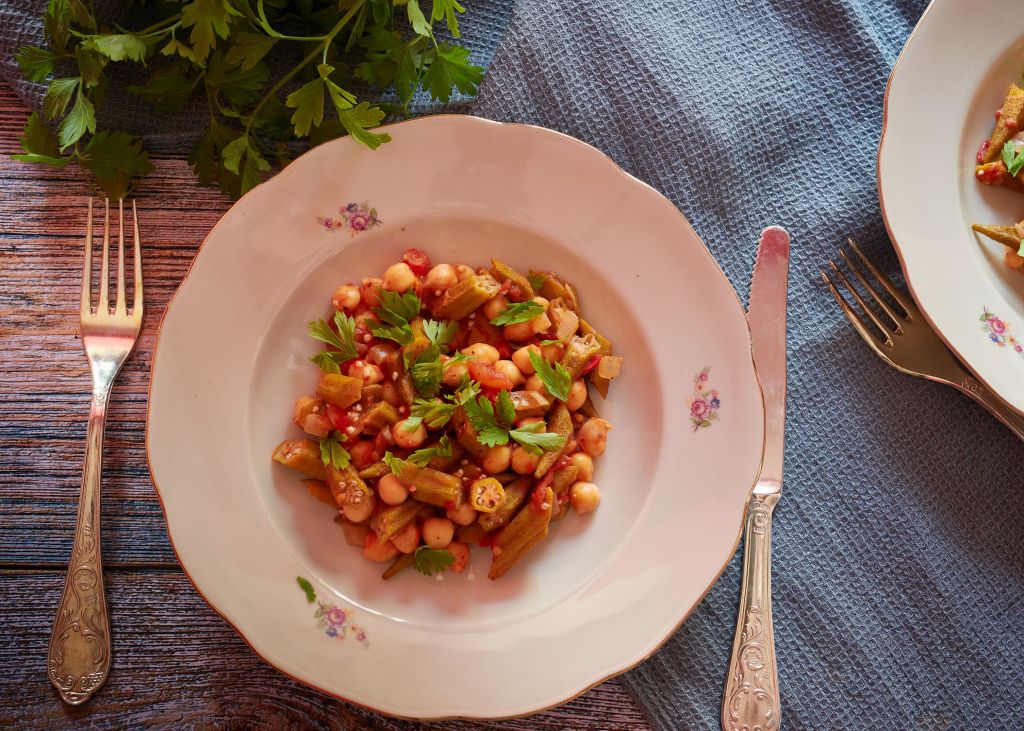Ако ползвате кора от лимон, добавете я заедно с бамята. Последно добавете отцедения нахут и гответе още около минута – две.