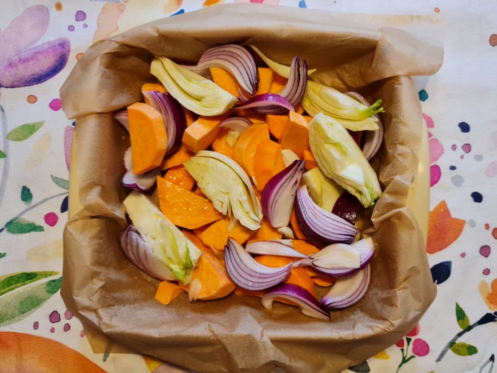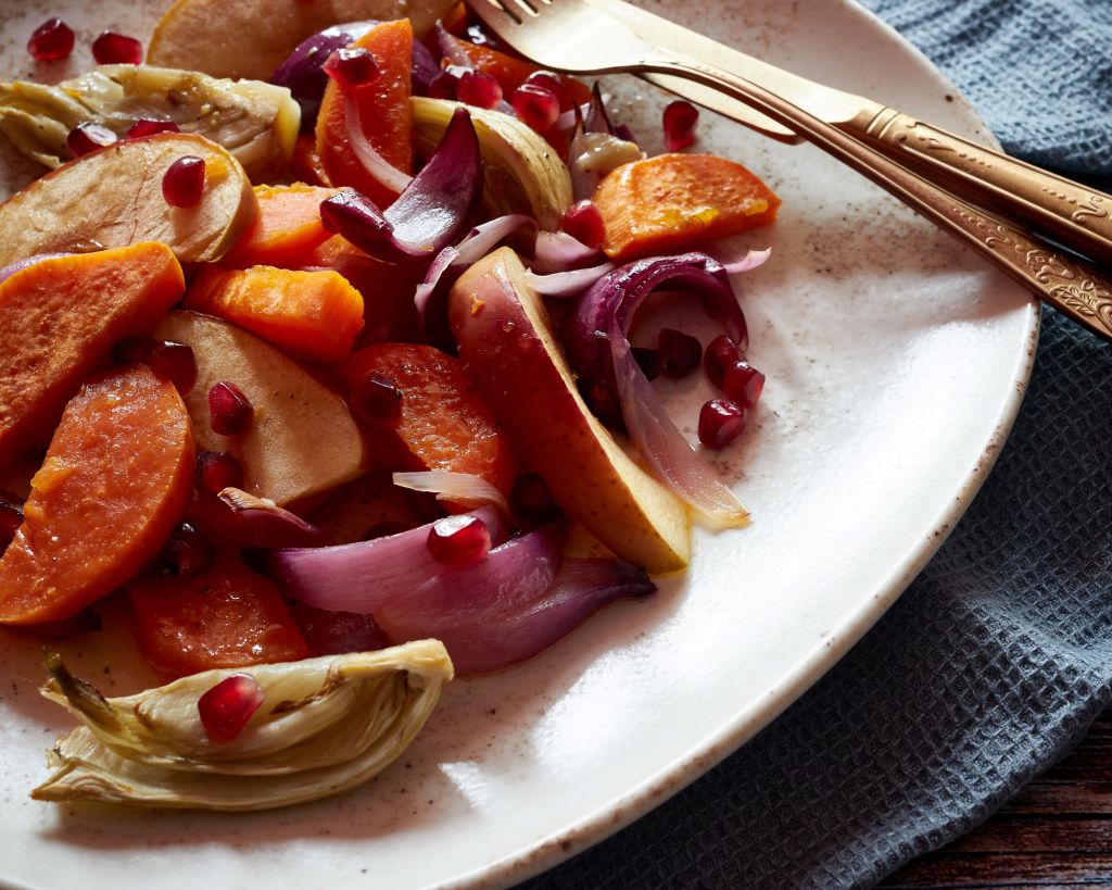 Преди десетина дни бях заета с подготовка за едно приключение с шипки и нямах време да мисля за менюто в къщи. Затова се наложи да се съобразя с наличностите, които включваха (покрай други неща) един средно голям сладък картоф, един фенел, който трябваше да е за бульон, но така и не стигна до него, червен лук, ябълки и нар. На пръв поглед леко странна компания, но това, което ги обединява, е сладостта. В някои много явна, в други по-скрита, по-скоро послевкус.