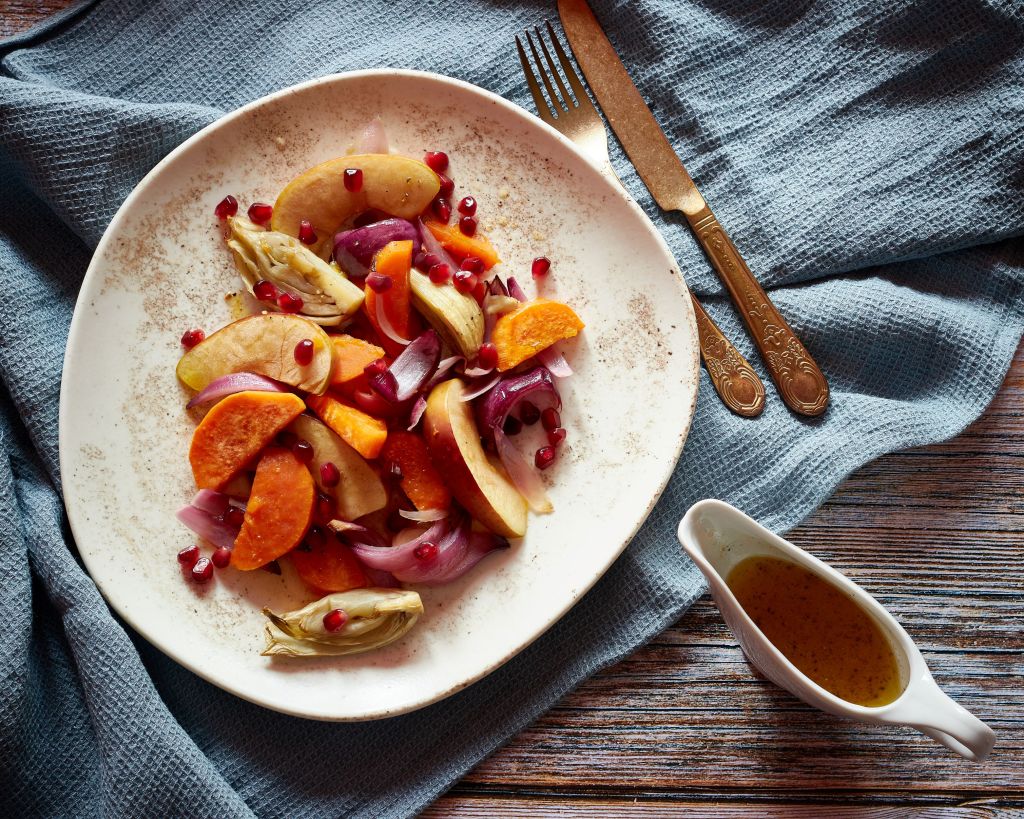 Извадете тавата от фурната и разпределете зеленчуците между две чинии. Полейте обилно с дресинг и гарнирайте с нар.