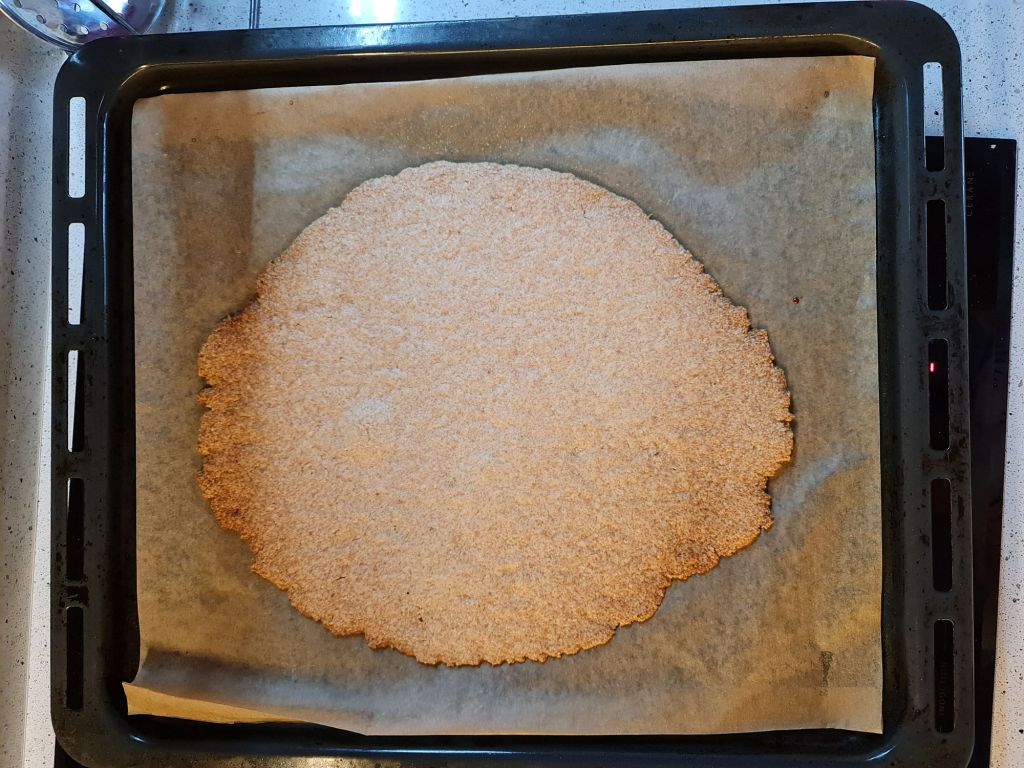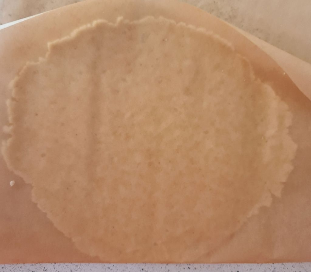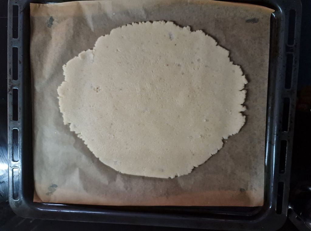 Моята торта се различава от оригинала основно по това, че бисквитите не са готови от пакет. Исках да направя тортата по-диетична и затова вместо купени бисквити, изпекох домашни от бадемово брашно с кокосово масло и еритритол – възможно най-простата веган версия на шортбред. Понеже бисквитите и така и така се трошат, реших да не губя време в оформяне и изпекох една голяма „бисквита“ от цялото тесто, която, след изстиване, начупих.