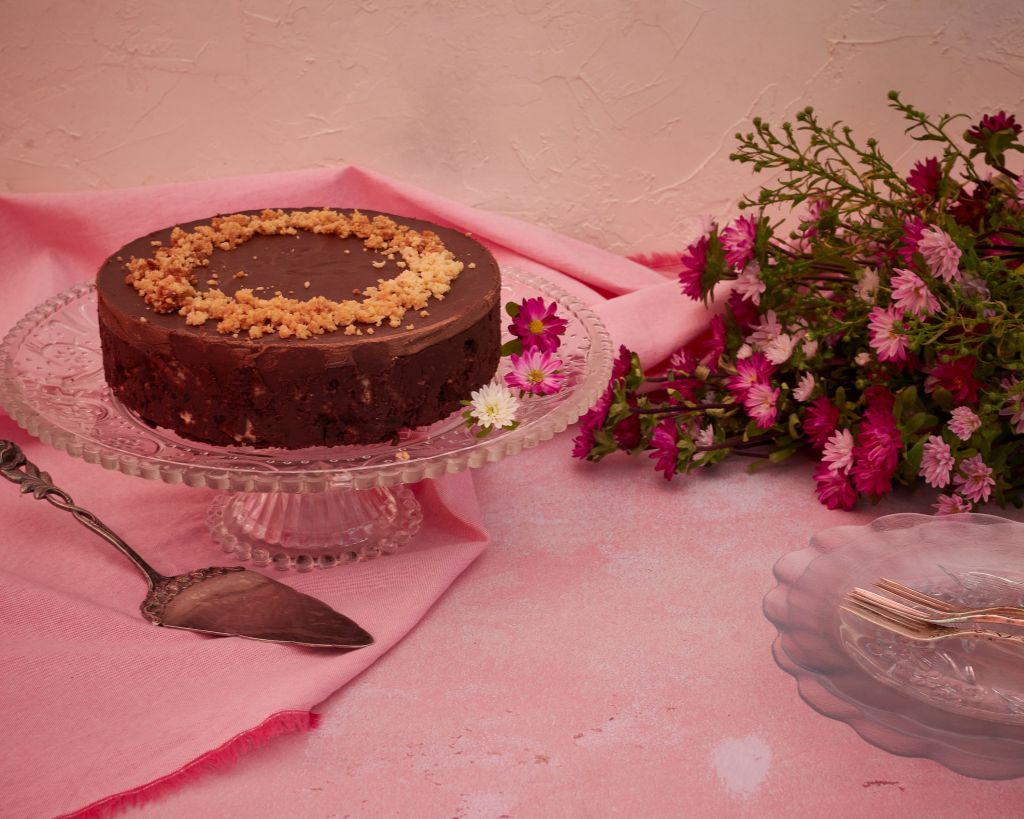 Вземете форма със свалящи се стени с диаметър 17 – 18 см и я намажете добре с кокосово масло. Изсипете сместа във формата и приберете в хладилника за около 2 часа, да стегне. Извадете от хладилника и залейте с ганаш. Приберете отново за поне половин час.