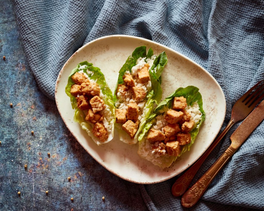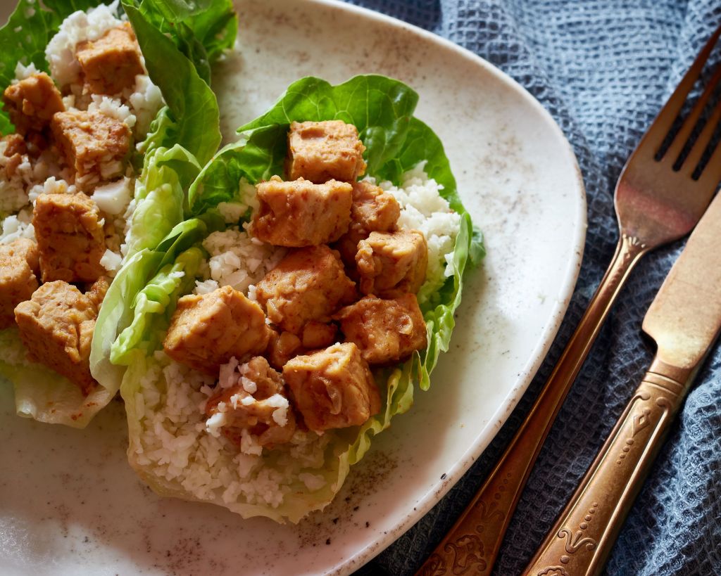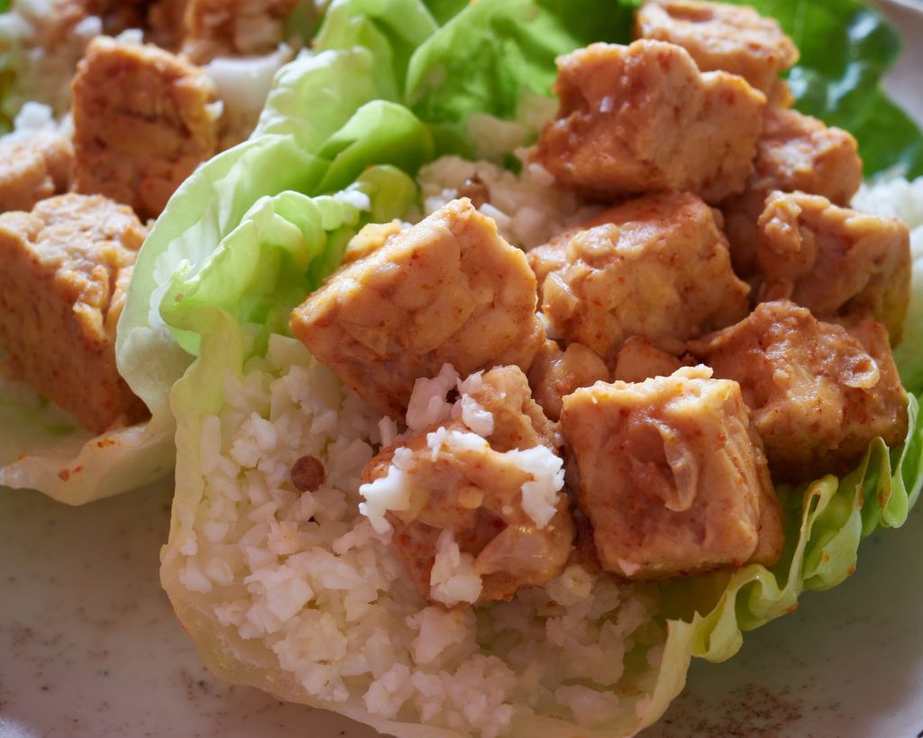 Този път избрах значително по-сериозна марината с къри и се убедих, че темпето наистина има нужда от повече вкус и аромат. Добавих „ориз“ от карфиол и „лодки“ от салата литъл джем. Дълго се колебах какво да добавя към ориза и се спрях на семена от кориандър – просто и много ароматно.