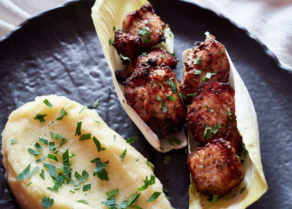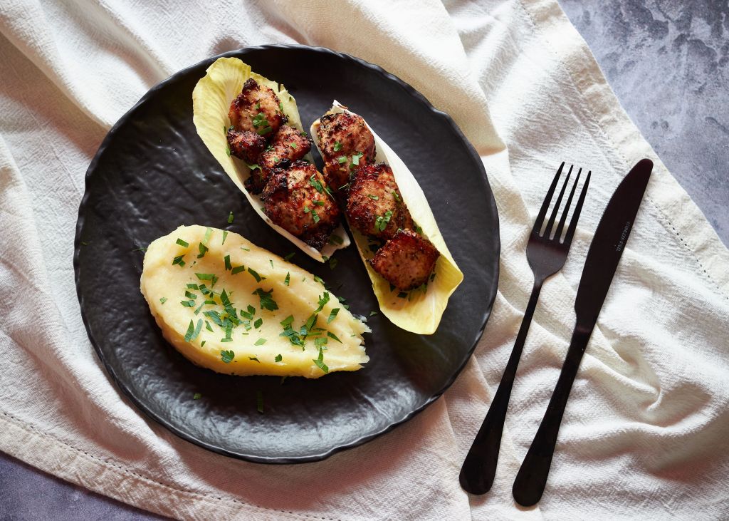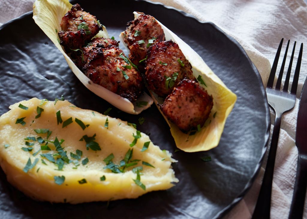 Сервирайте върху листа цикория или салата, с пюрето от пащърнак и нарязан магданоз.