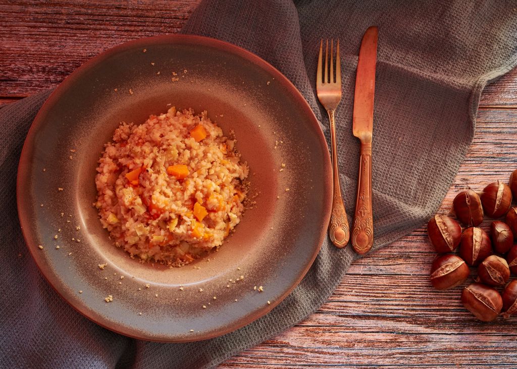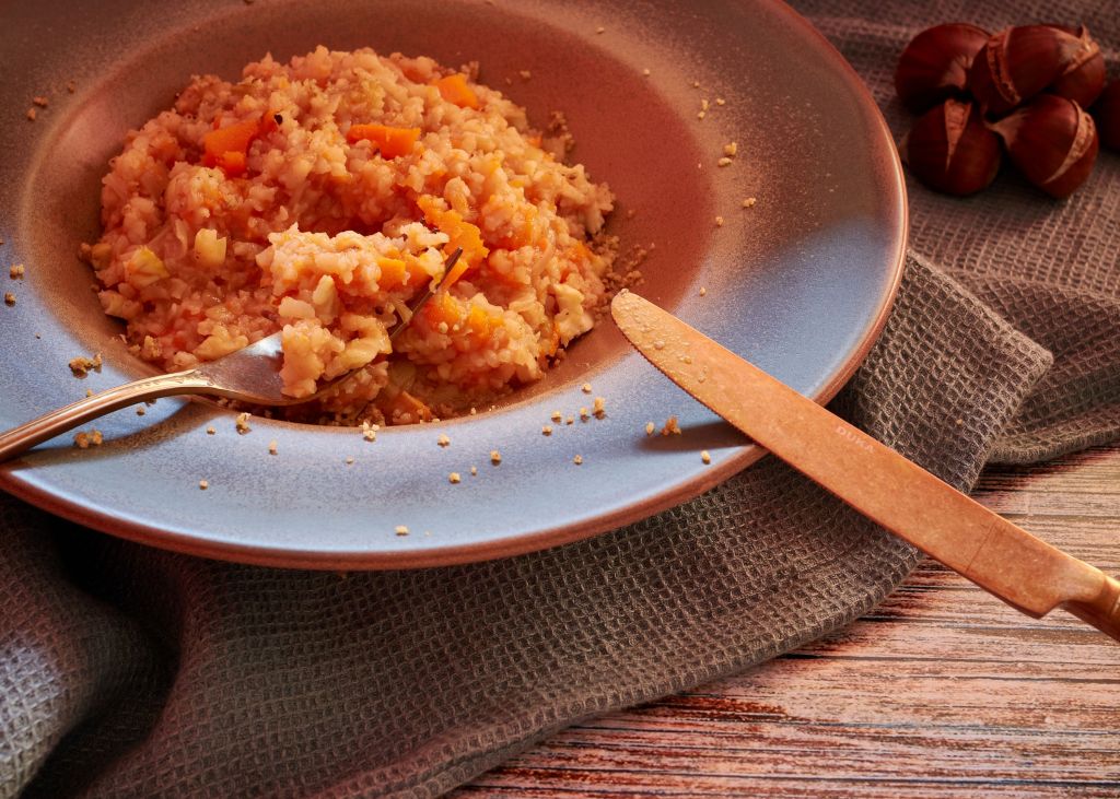 Обикновено тиквата и кестените се свързват с рецепти за десерти, но тук ви предлагам солено ястие, което би било прекрасна идея за обяд или вечеря, придружено от чаша вино. Тиквата и кестените придават леко сладък вкус, който се подчертава от индийското орехче и се балансира от солта и черния пипер.