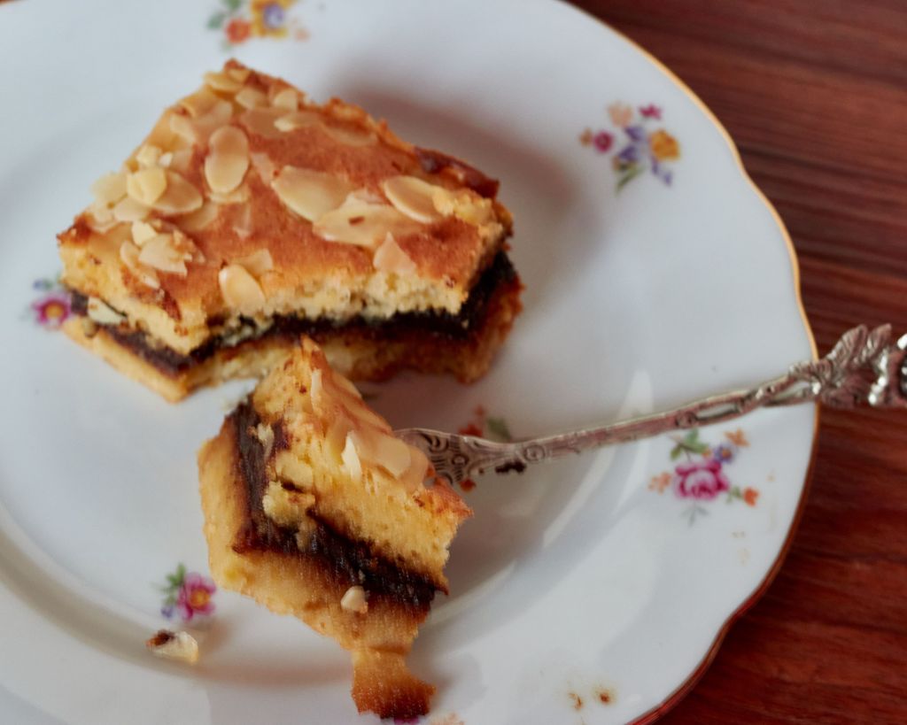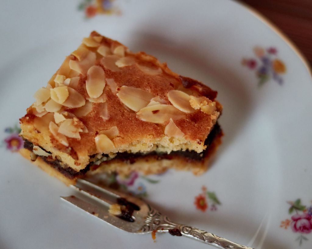За основа използвах еднo вече два пъти проверенo тесто с бадемово брашно. Другите рецепти можете да видите тук и тук. Разликата при тази е, че не се използват пресни плодове. Вместо това разделих тестото на две части. Първо изпекох едната. Върху нея намазах слой мармалад и изсипах останалото тесто отгоре. Завърших го с филирани бадеми.