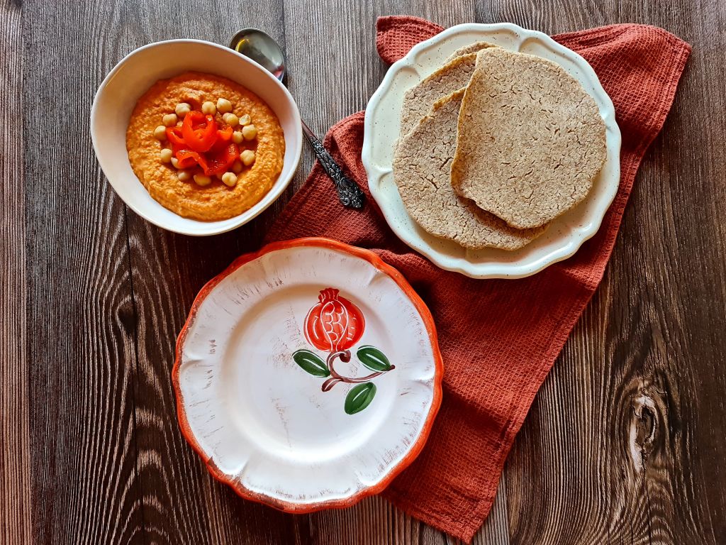 Сервирайте питките с хумуса и с нарязани печени чушки.
