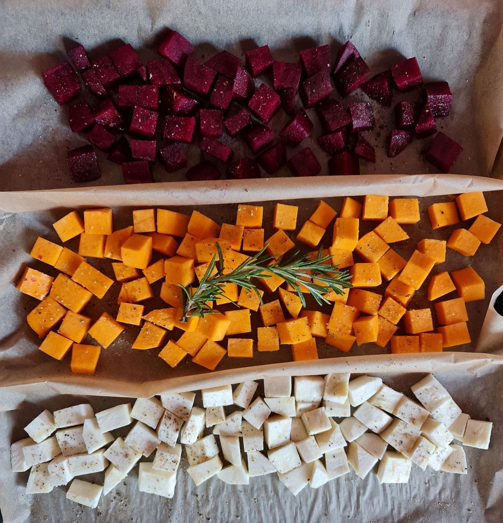 Загрейте фурната до 200 градуса. Разположете зеленчуците в голяма тава върху хартия за печене, като ги разделите един от друг. Това е за да не позволите на цвеклото да оцвети останалите, но и защото времето за печене е различно и по този начин ще ви е по-лесно да извадите част от тях по-рано. Добавете клончето розмарин (аз го слагам при тиквата). Подправете със сол и черен пипер и поръсете с около половин супена лъжица зехтин (най-лесно е със спрей).