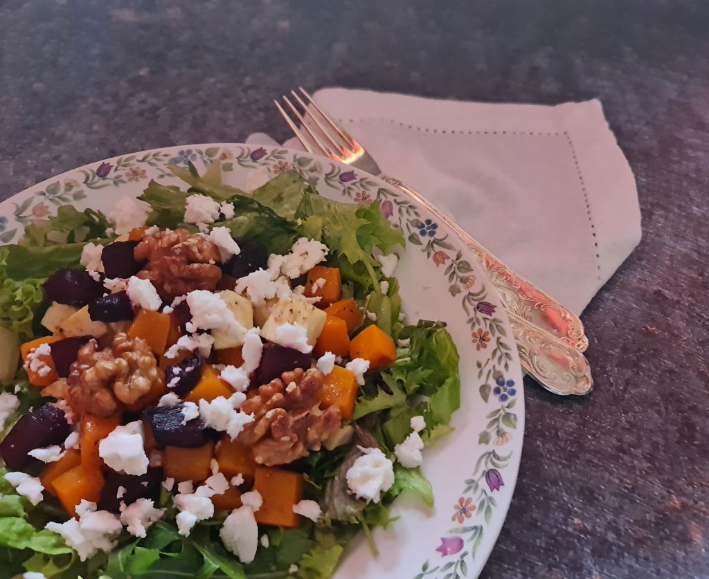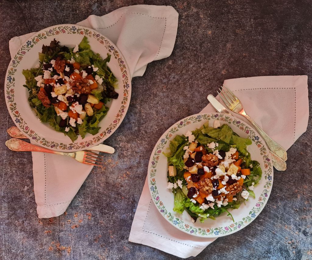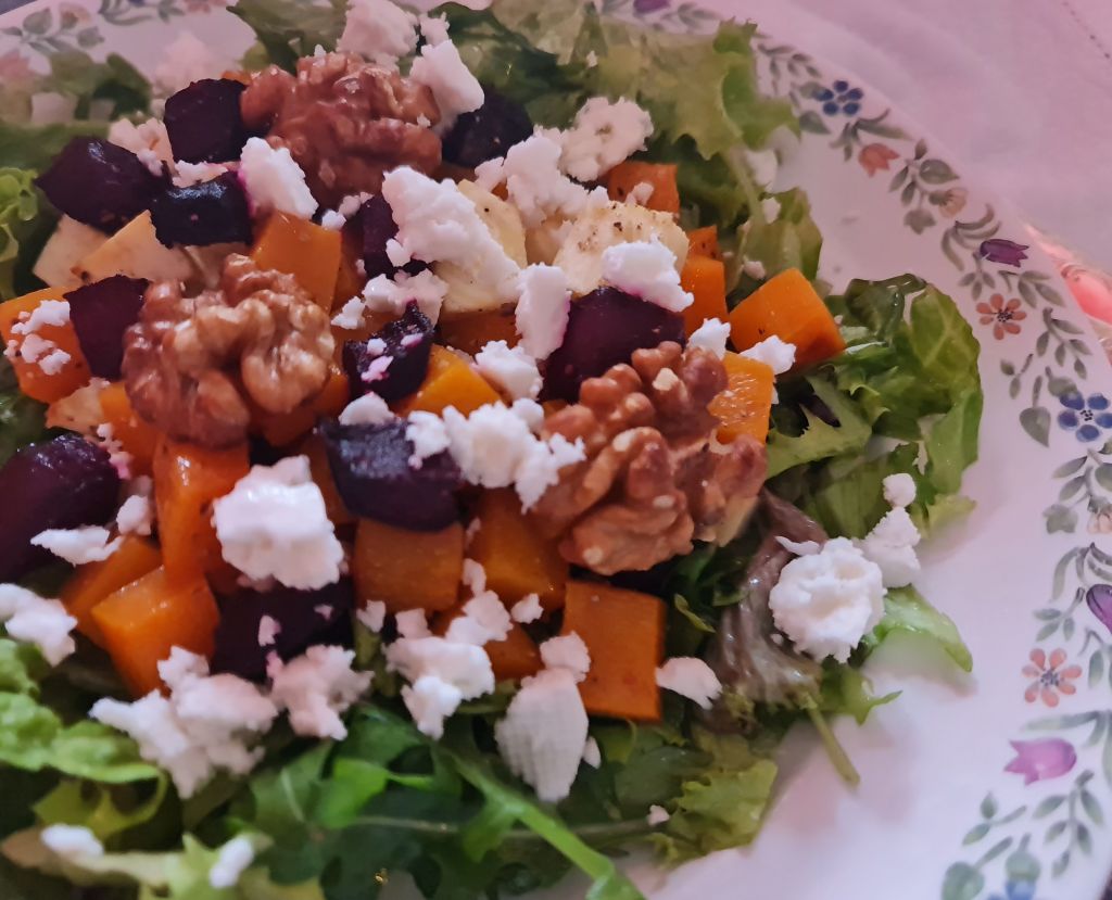 Салата е конструирана около кубчета печени тиква, червено цвекло и пащърнак, които в момента са в сезон. Компания им правят зелени салати, орехи и козе сирене. В салатния сос съм добавила мед от Истински мед.