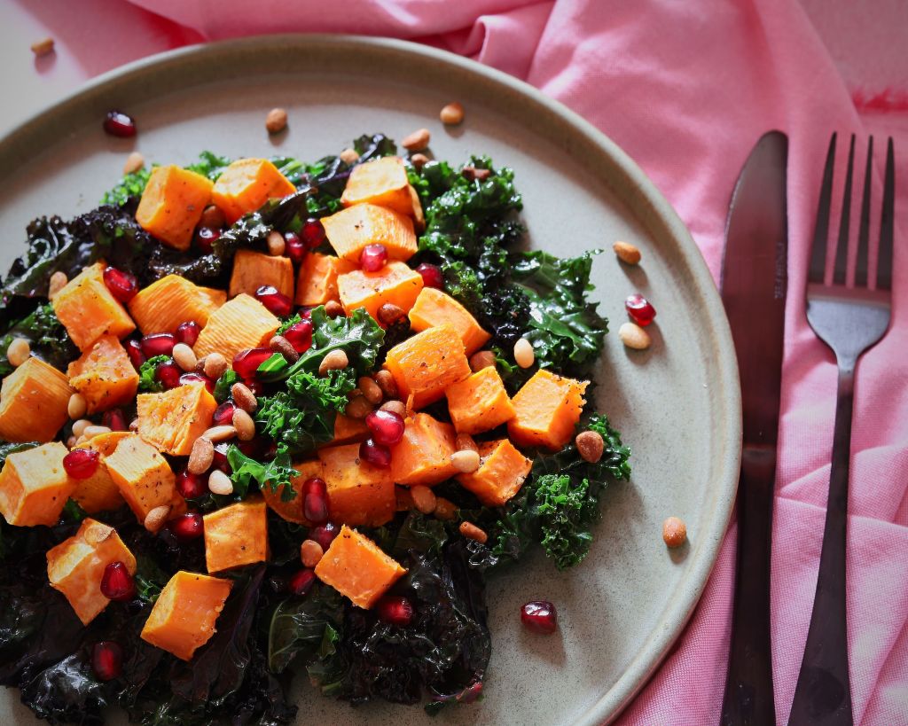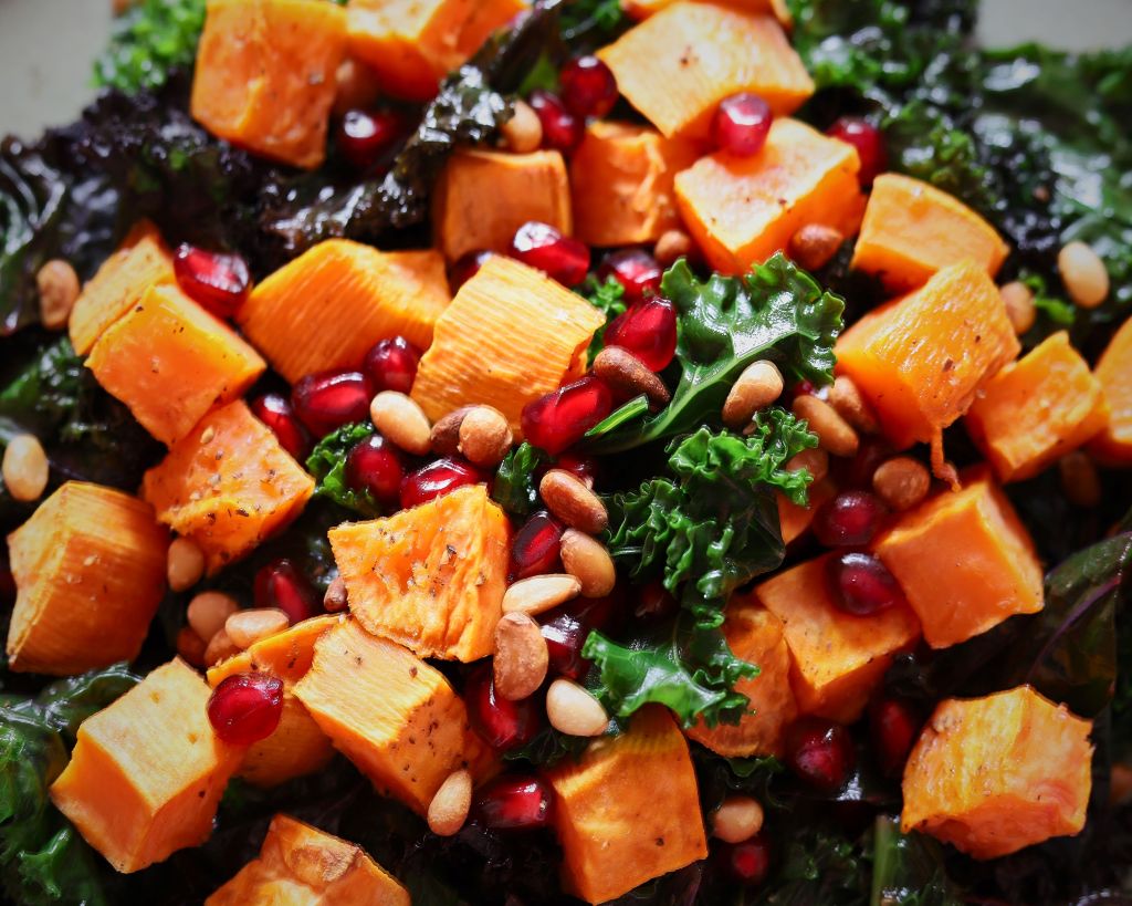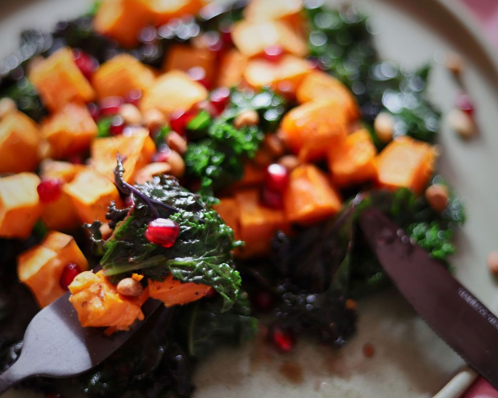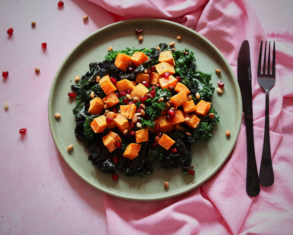 Освен кейл, за тази салата изпекох сладък картоф (може да замените с тиква, ако нямате) на кубчета. Добавих нар и леко запечени кедрови ядки. Салатният сос е от зехтин, ябълков оцет и меласа от нар.