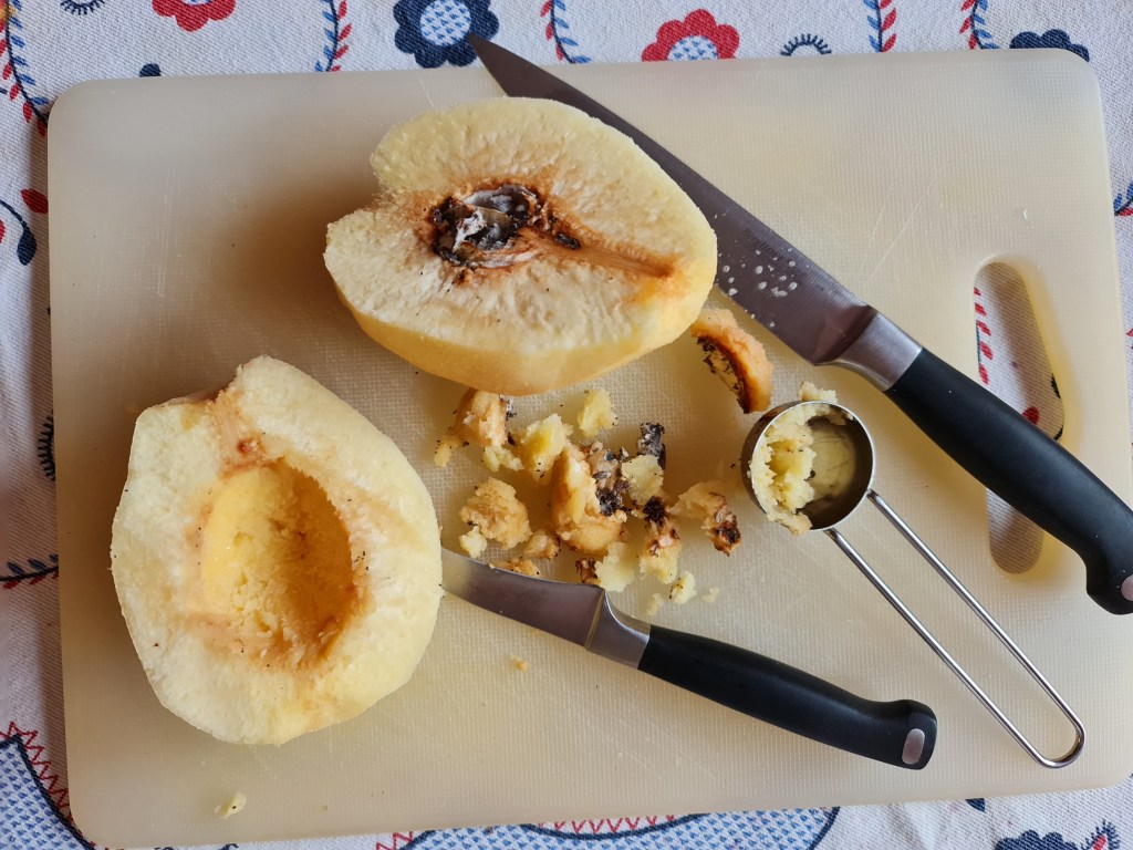 3 и 1/2 големи дюли, обелени, срязани на половина и почистени от вътрешността
