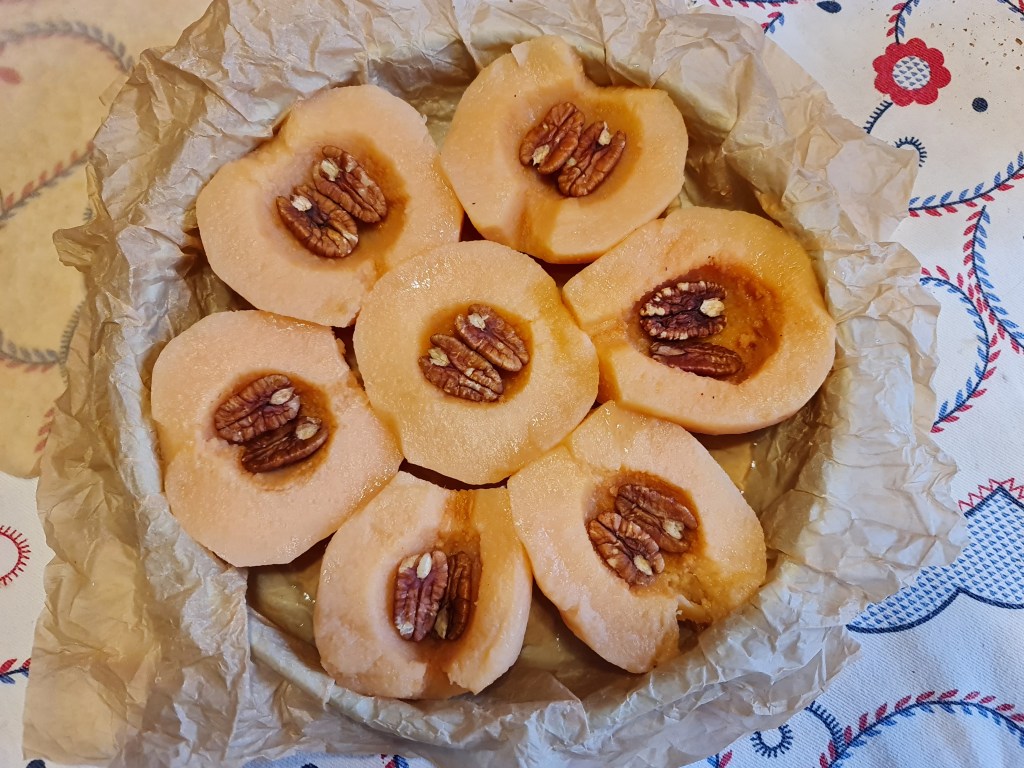 Ако ще печете в съда, в който сте сгъстили соса, изчакайте да изстине леко и наредете дюлите под формата на цвете, с вътрешната страна нагоре, върху сгъстения сос. Ако ще печете в друг съд, вземете тава с диаметър 23 см. За улесняване на обръщането, може да покриете с хартия за печене. Изсипете сиропа в тавата и върху него разположете резените дюля, които сте подсушили. Добре е да са плътно една до друга. Тъй като моите дюли са половинки и имат тези прекрасни вдлъбнатини, аз сложих и по 2 ядки пекан във всяка.