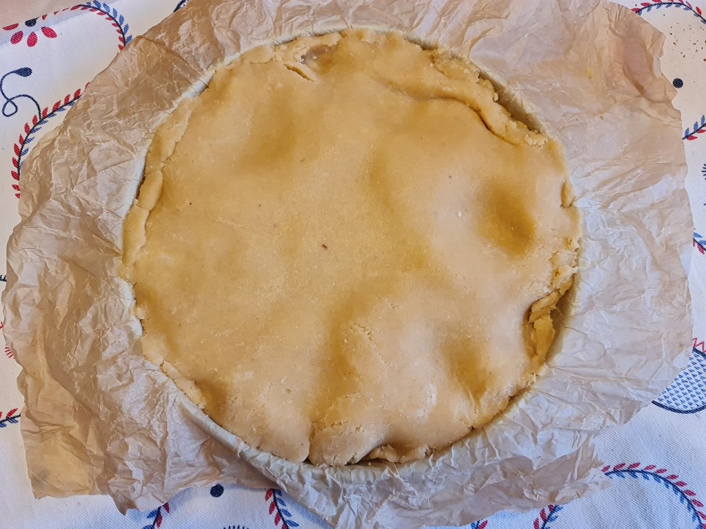 Пресейте брашната със солта и еритритола. Добавете маслото и смесете добре с голяма вилица или ръчен блендер за тесто, докато получите трохи. Добавете леко разбитото яйце и омесете тесто. Увийте във фолио или восъчна кърпа и приберете в хладилника за половин час (може и повече, ако само подготвяте тестото и ще печете по-късно).