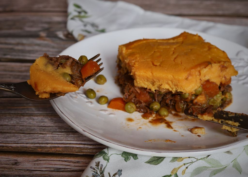Вместо кайма, сложих еленското месо и вместо картофено пюре – такова от сладки картофи, моркови и пащърнак с малко масло и пармезан. Останалото е горе-долу стандартно – лук, чесън, моркови и грах, но вместо царевица, сложих манатарки (имам замразени).