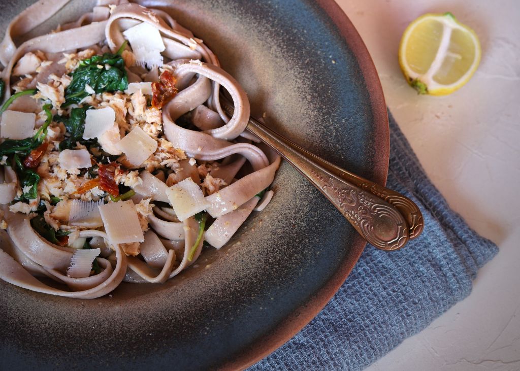 Пастата е прясна от 100% елда (любима напоследък, тъй като е безглутенова и много вкусна). Понеже пастата има склоност да изсъхва, направих сос от водата в която е вряла и горчица, който прекрасно си хармонира с вкусовете на останалите съставки.