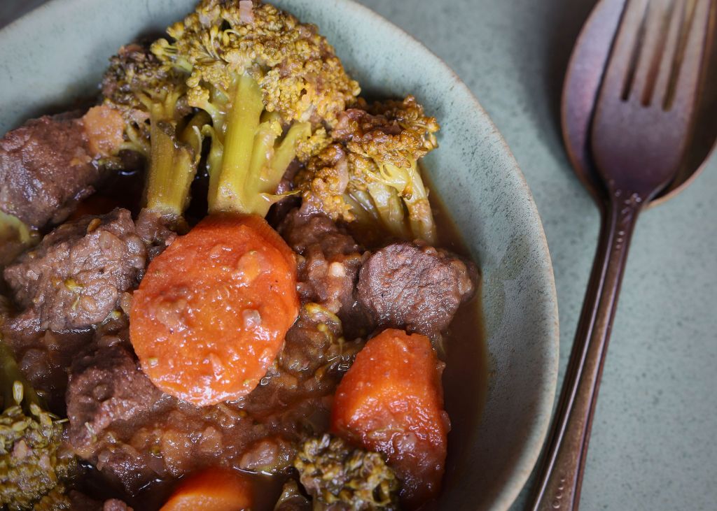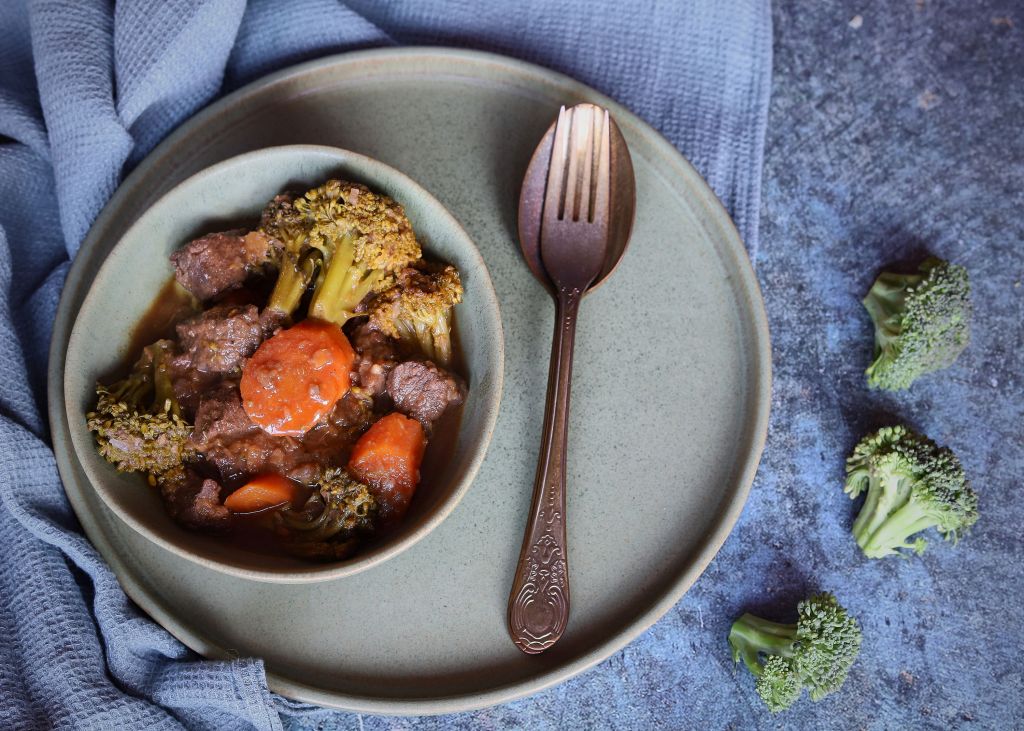 Добавете сладкия картоф и гответе още 10 минути. Добавете броколите и розмарина, подправете със сол и черен пипер и гответе още 10 – 15 минути, докато месото и зеленчуците са готови. Опитайте преди да свалите от котлона.