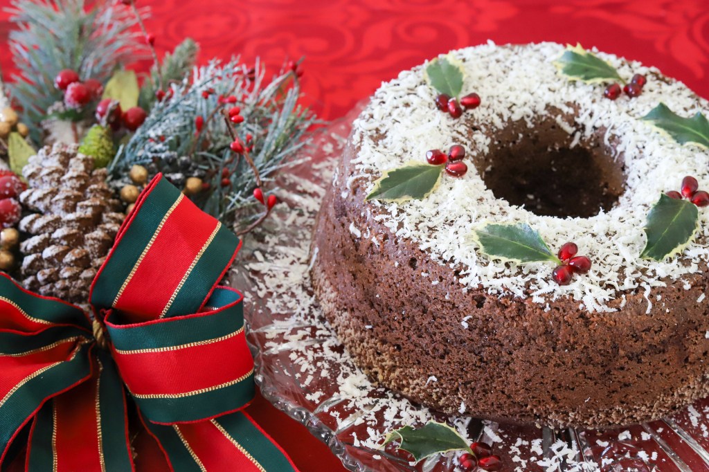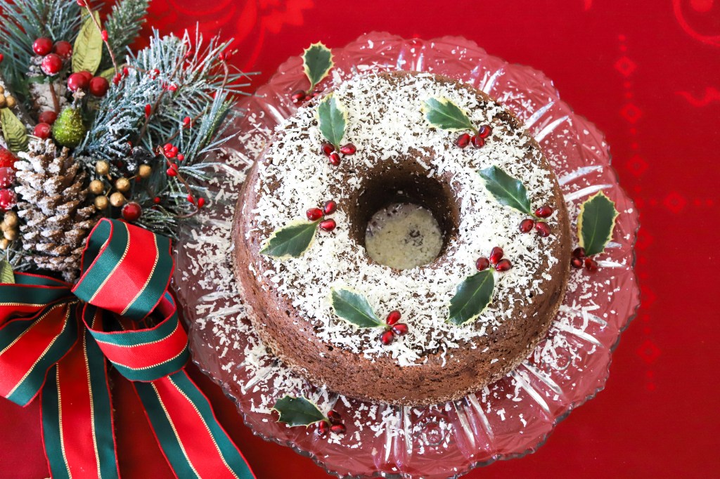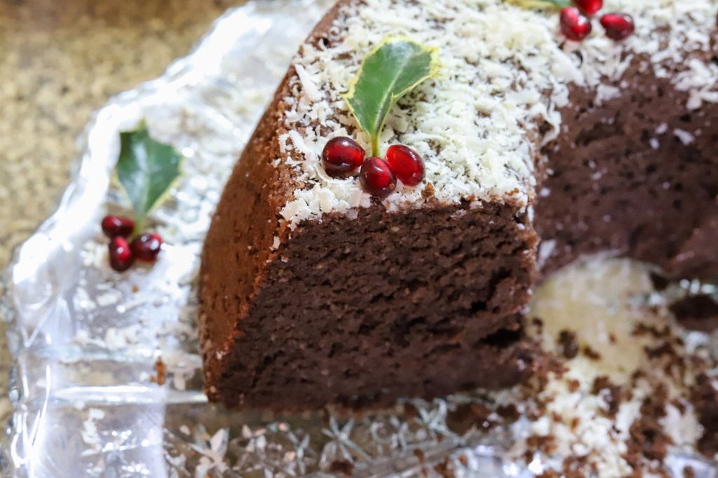 Коледно-новогодишните празници са време за уютни семейни събирания, дълги разговори и вкусна домашна храна. Какъв по-добър завършек за празничния обяд или вечеря от нещо много шоколадово. Като този кекс със сурово какао и парченца тъмен шоколад, завършен с настърган бял шоколад.