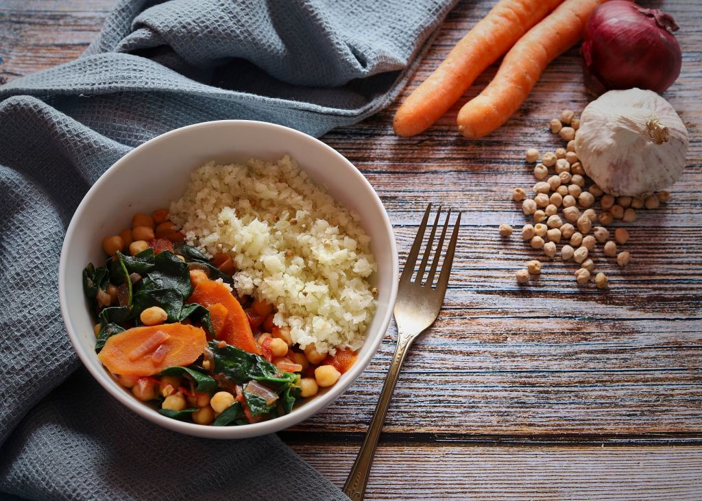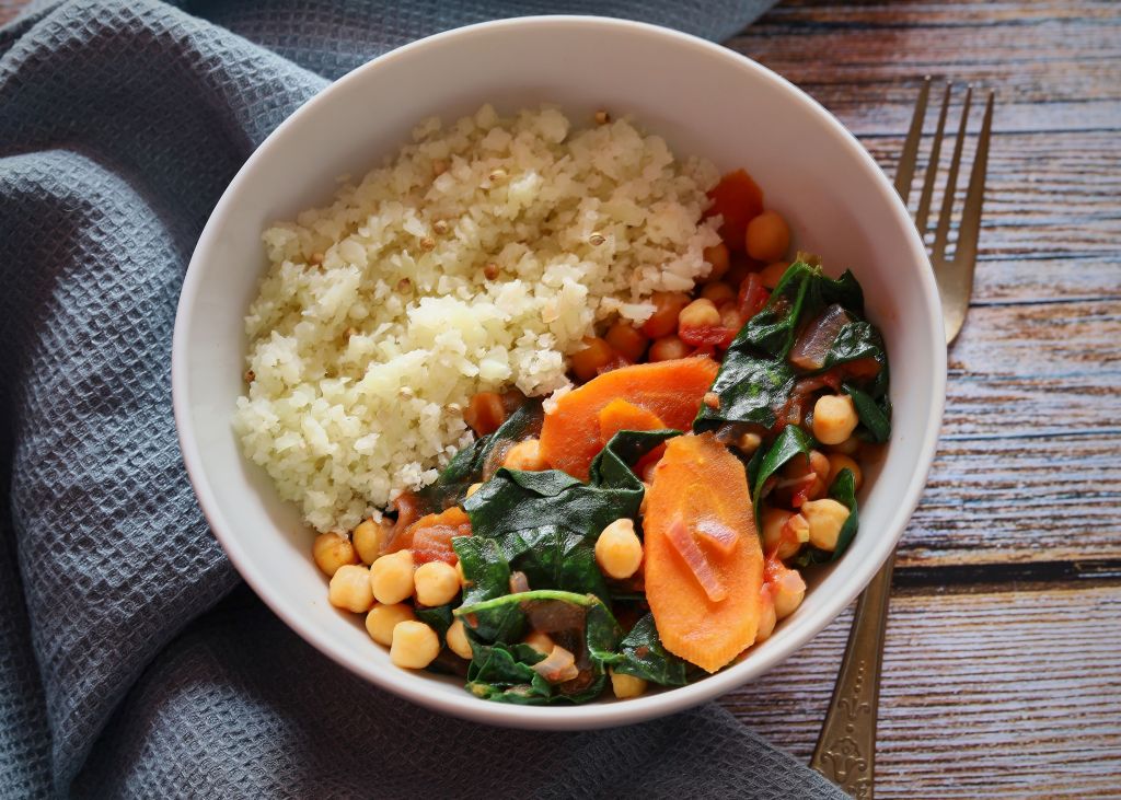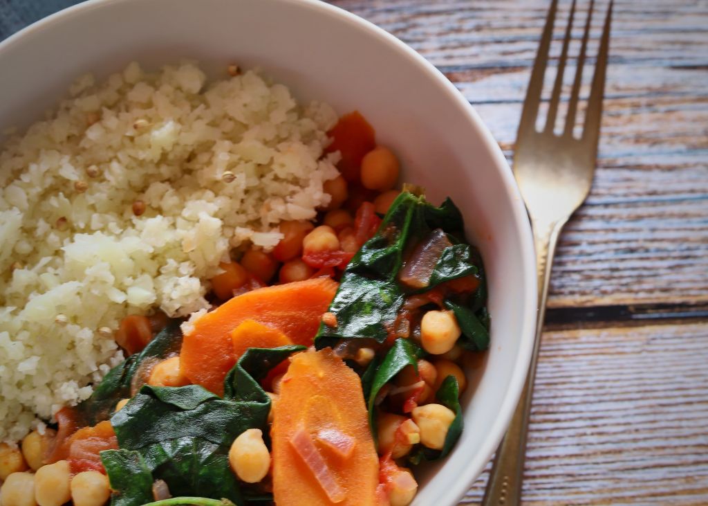 Есента и зимата са идеалнн сезон за къри, заради богатия избор на зеленчуци. Аз имах спанак, моркови и карфиол. Това ястие обикновено се сервира с ориз басмати, но тези от вас, които се интересуват от нисковъглехидратно хранене, знаят че карфиолът е много добър заместител. Затова, вместо да го сложа в кърито, го направих на „ориз“ и го сготвих на пара.
