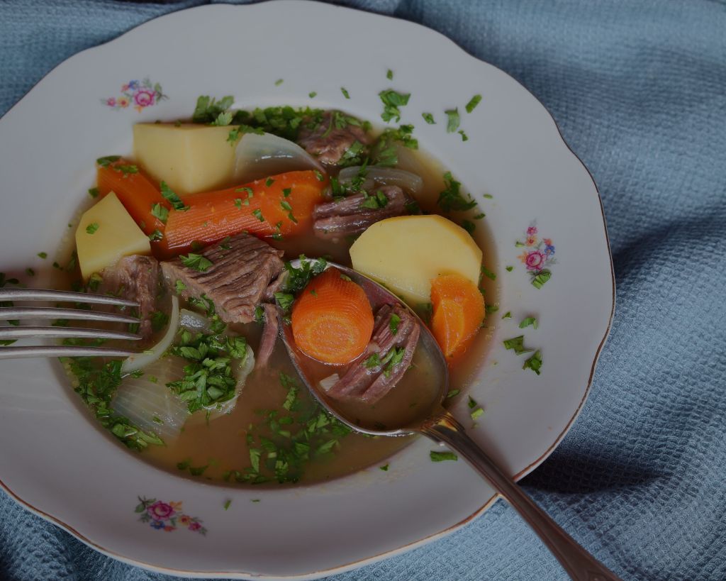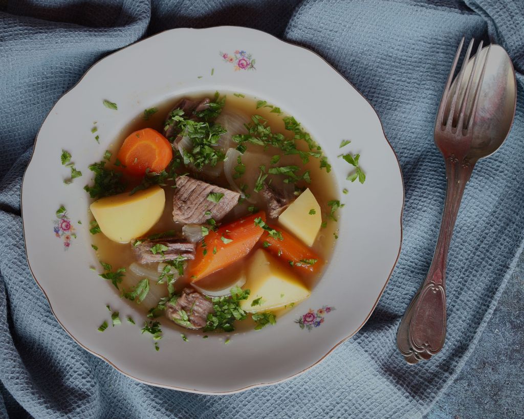 Извадете месото и пасирайте бульона. Може и да прецедите, но вкусът ще загуби. Загрейте отново и добавете морковите. Гответе 12 – 15 минути и добавете лука, чесъна и картофите. Гответе докато картофите са готови – около 30 минути. Подправете със сол и черен пипер и върнете месото в супата. Варете още около 5 минути и свалете от котлона. Сервирайте с нарязан пресен магданоз.